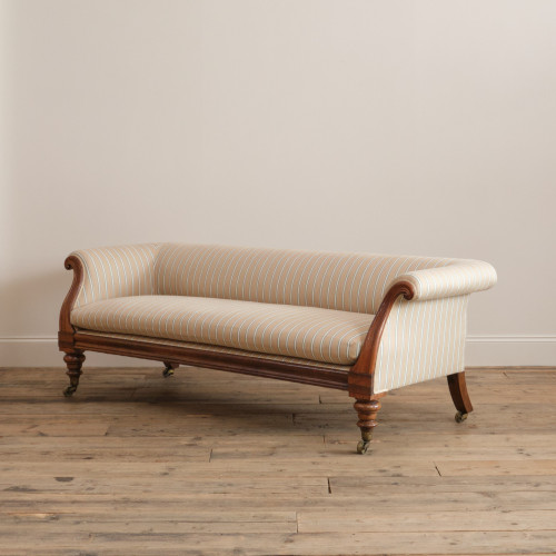 Regency armchair raised on 4 thick turned walnut legs with Cope & Collison gilt brass casters. A crisply carved panel across the inside back and shapely carved fronts.