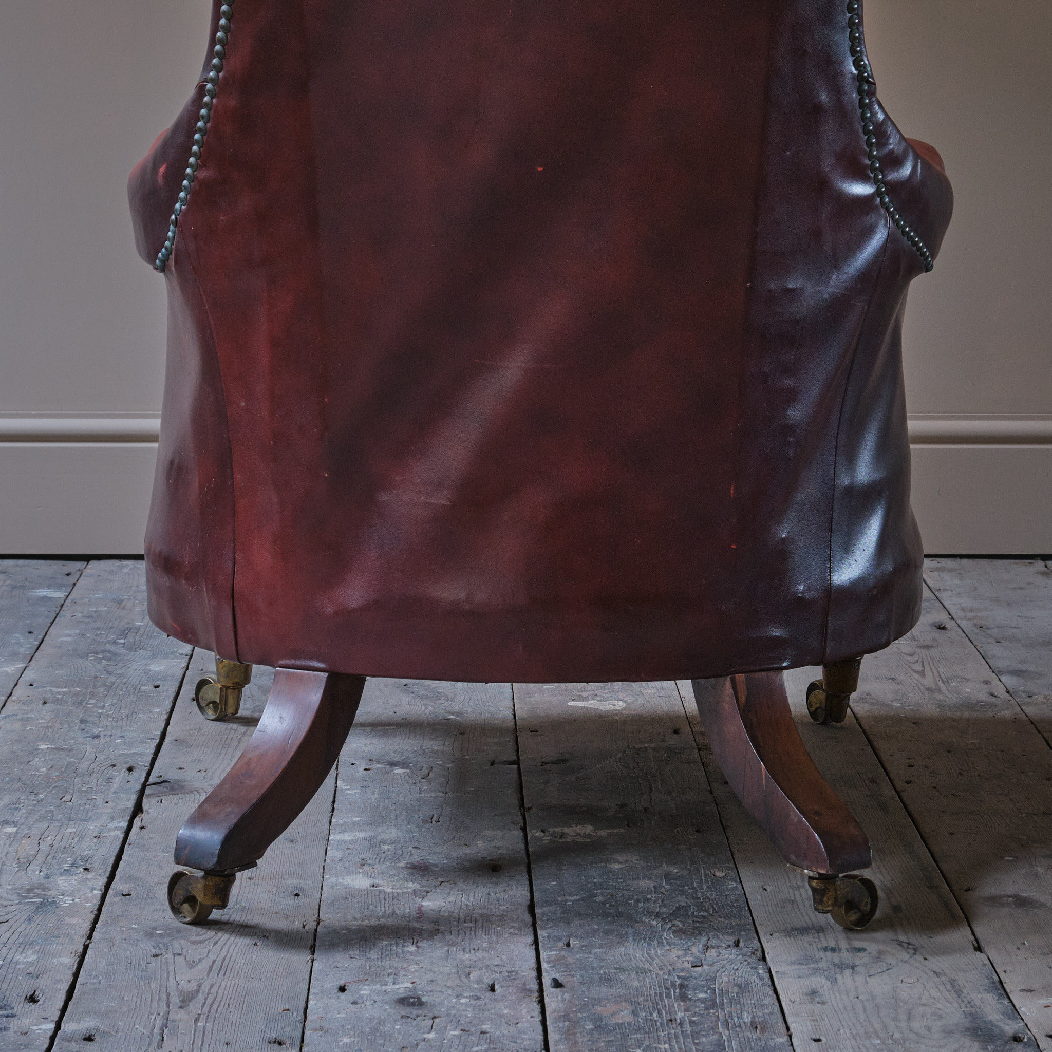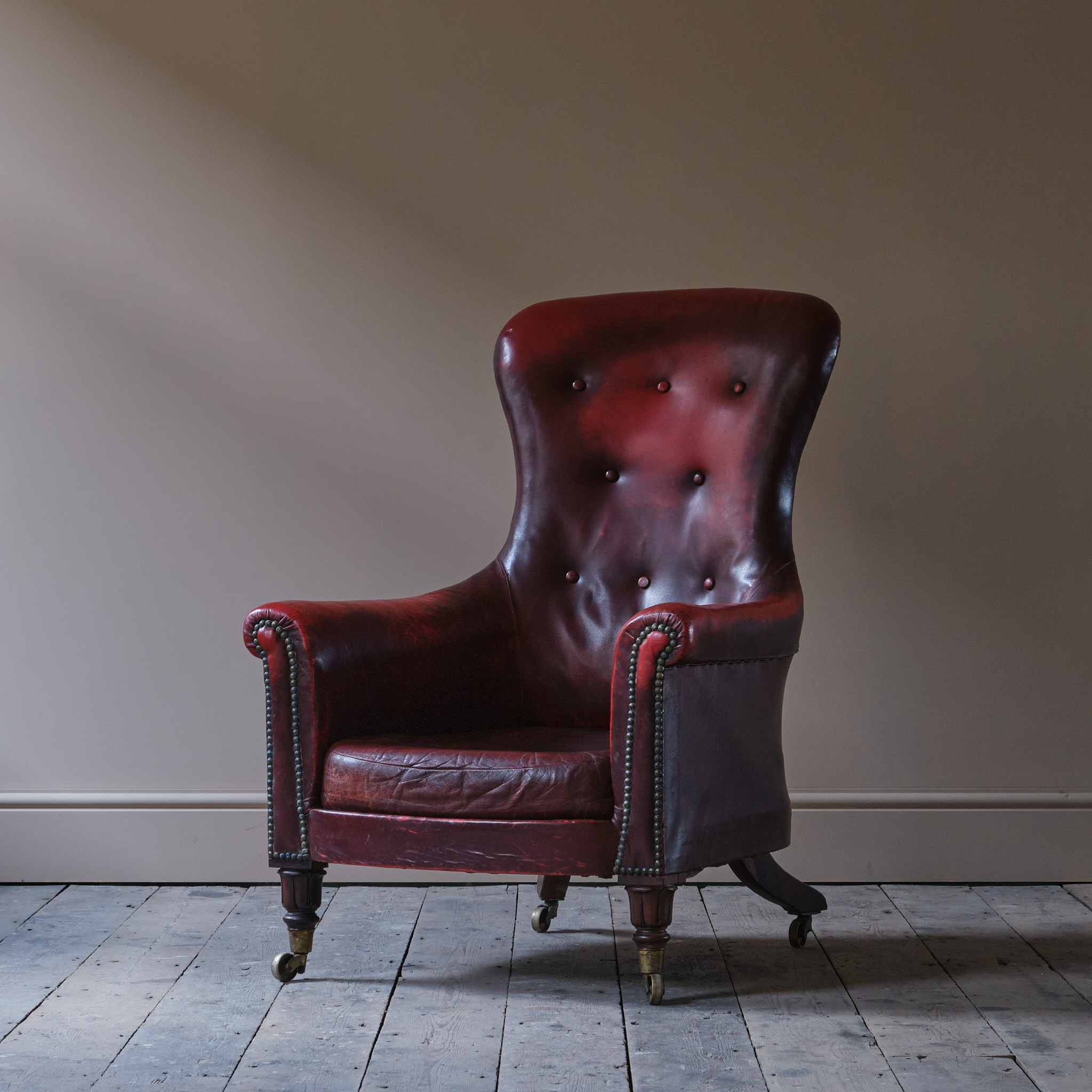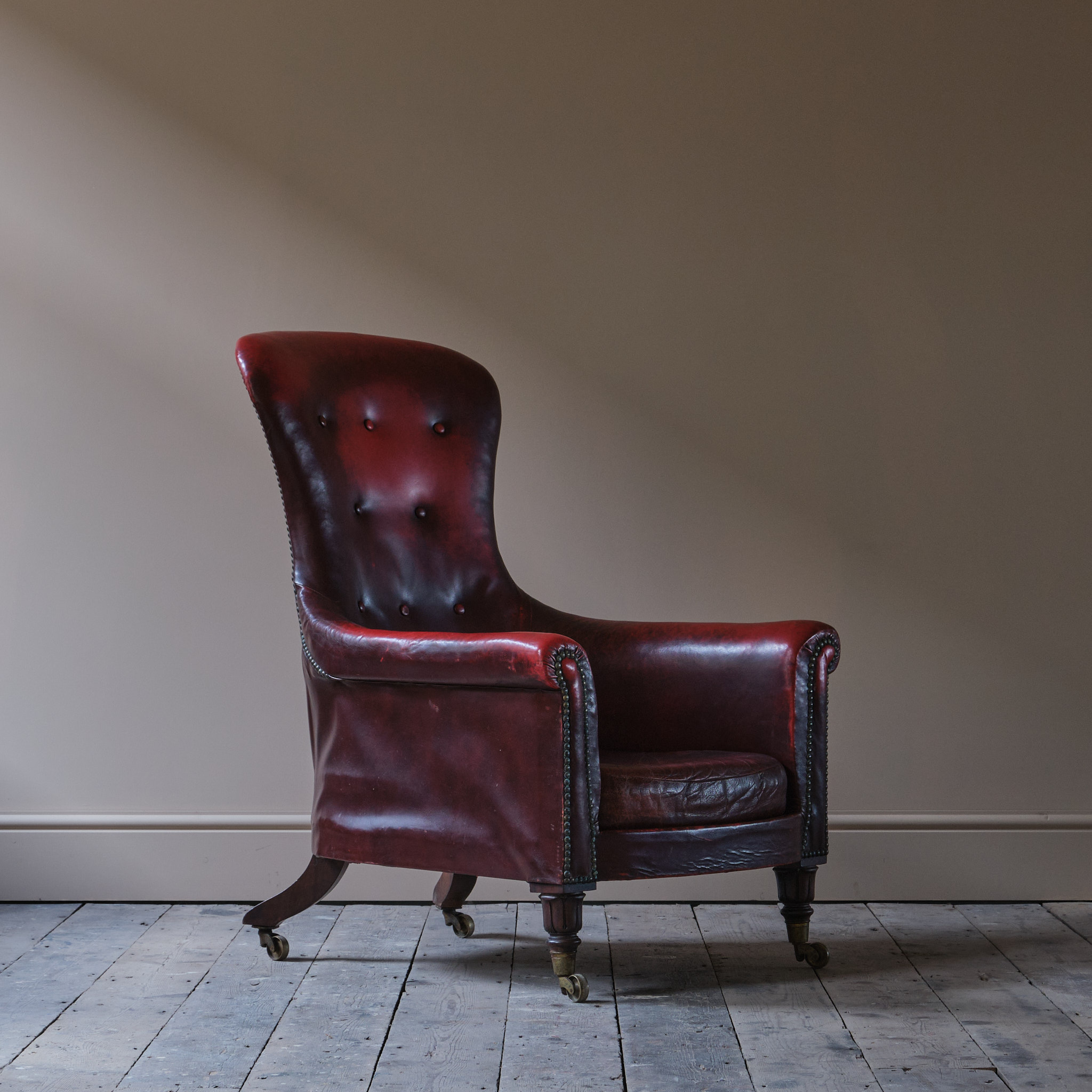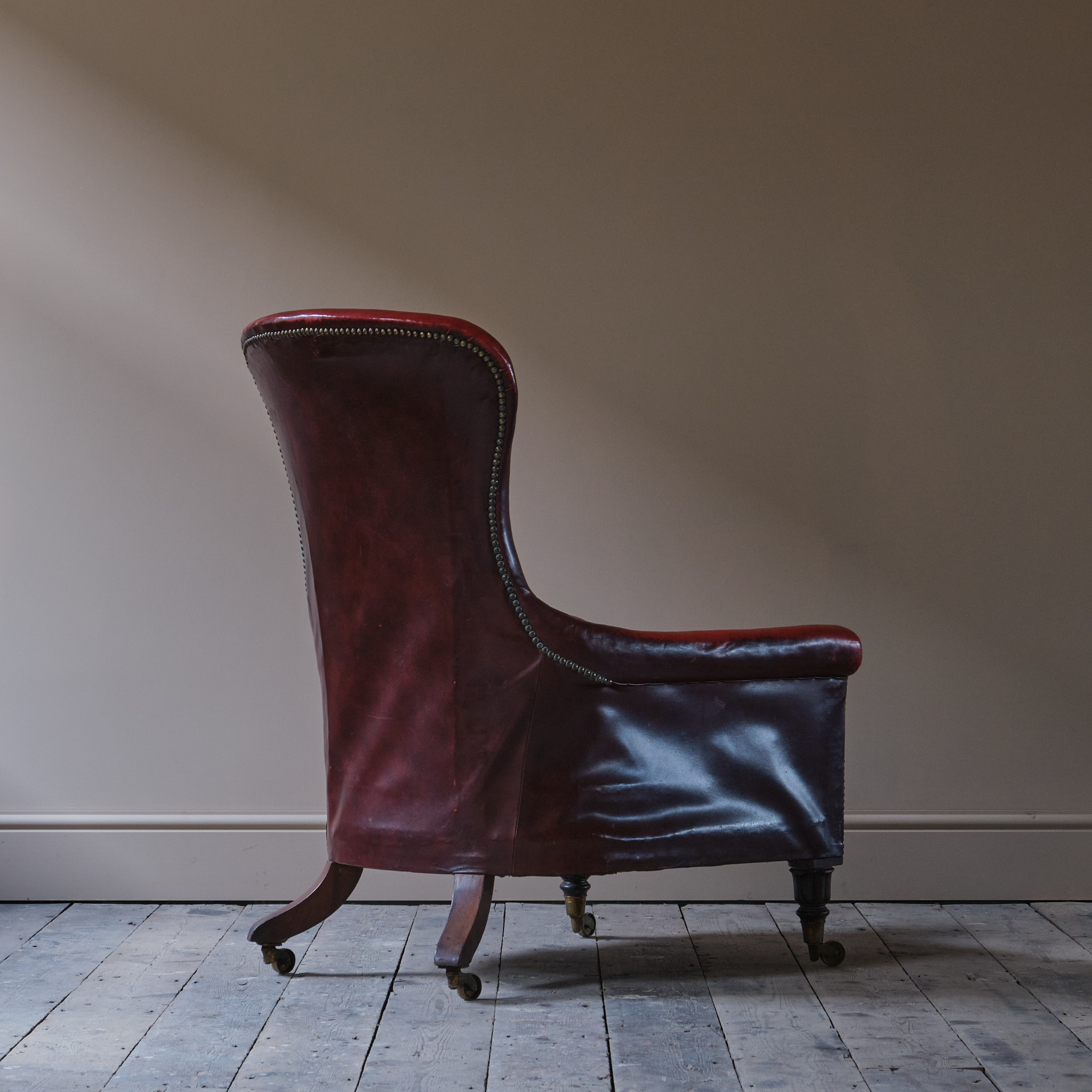 A wonderfully deep seated William IV country house library armchair. Raised on turned and carved Rosewood front legs with the most dramatic splayed Rosewood rear legs. Currently upholstered in faded red leather.