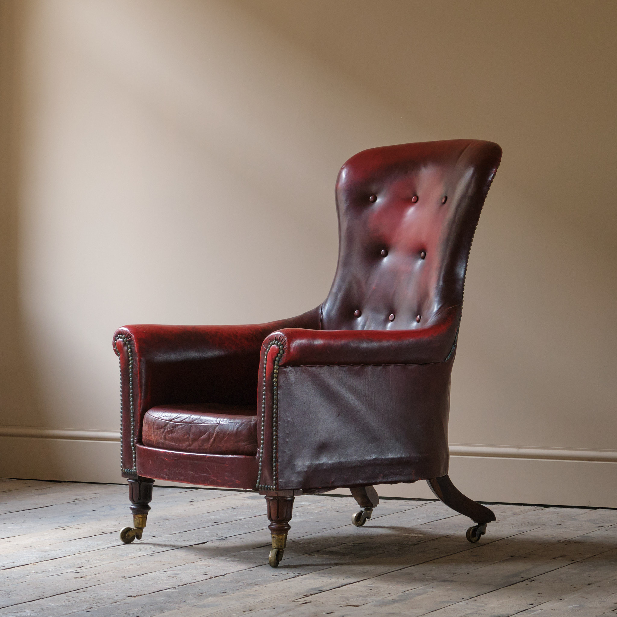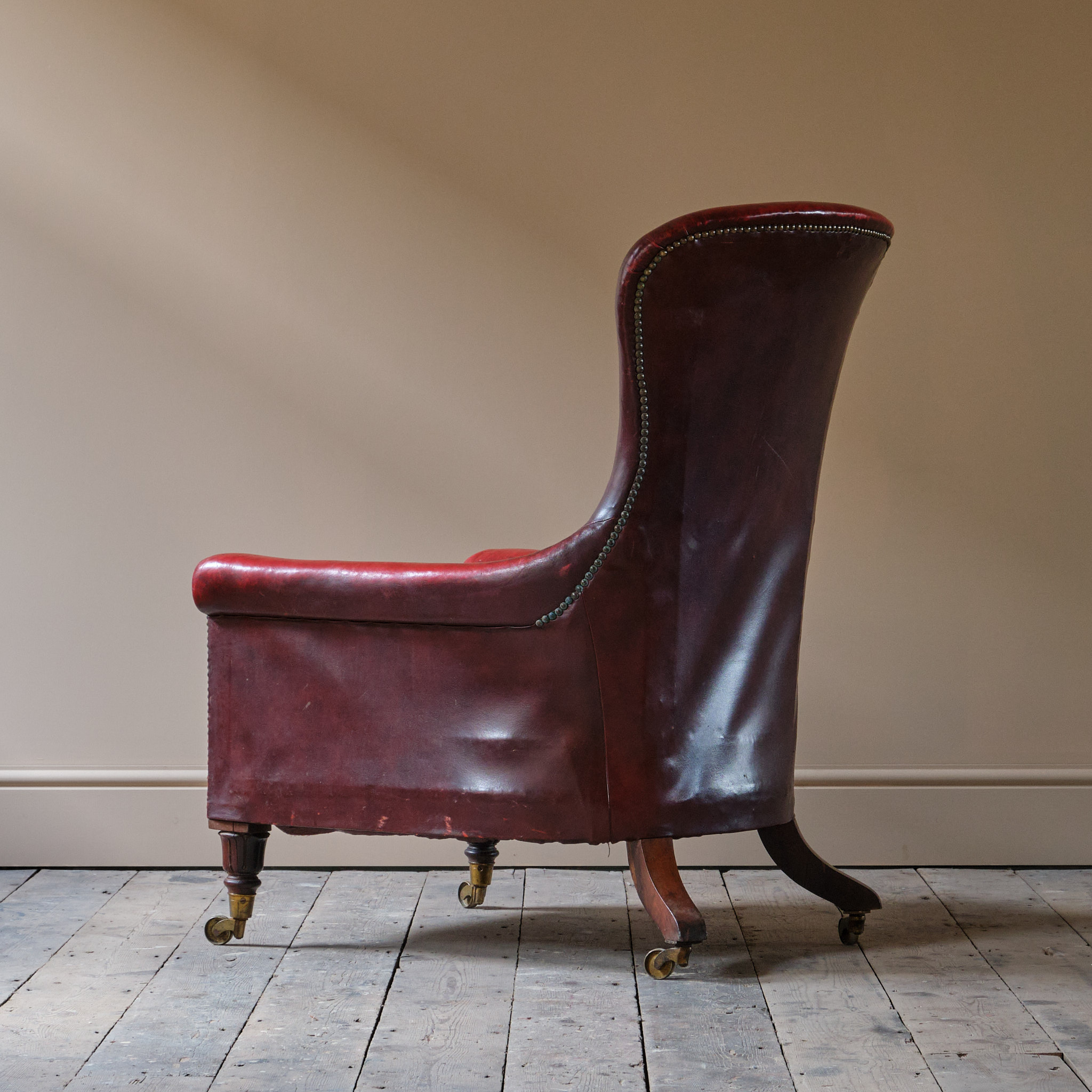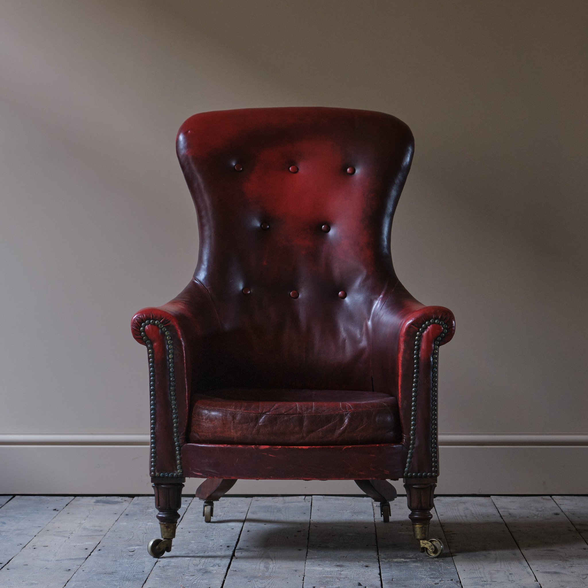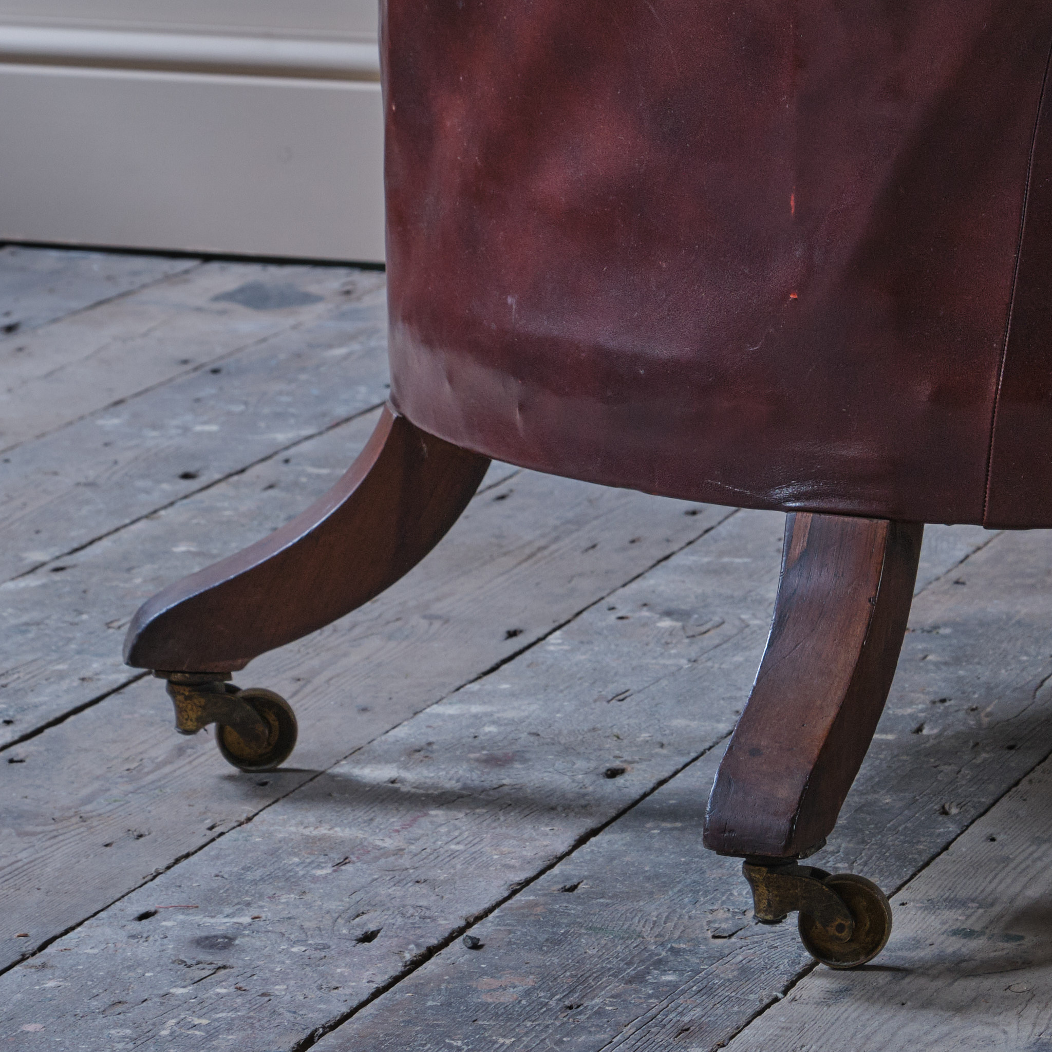 A wonderfully deep seated William IV country house library armchair. Raised on turned and carved Rosewood front legs with the most dramatic splayed Rosewood rear legs. Currently upholstered in faded red leather.