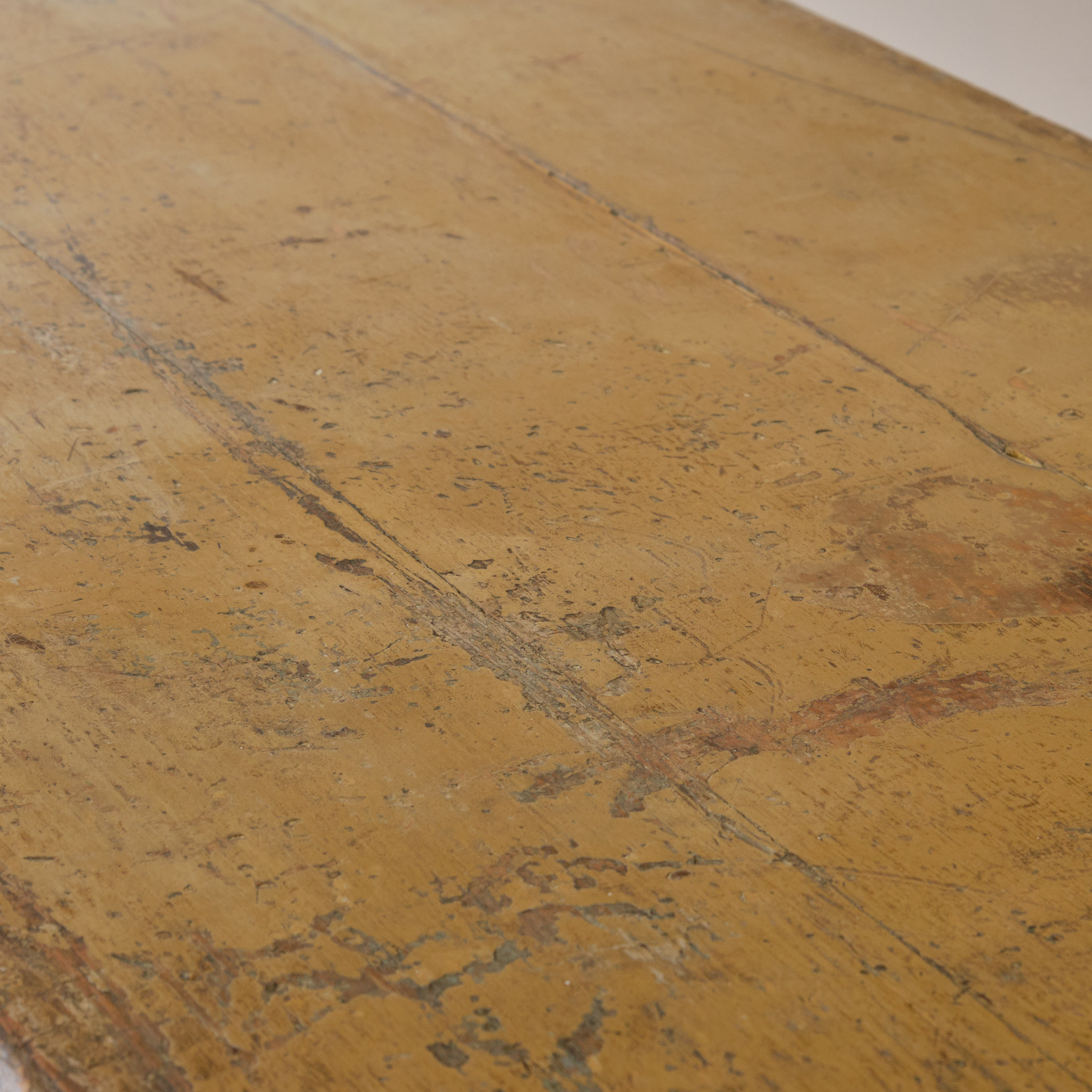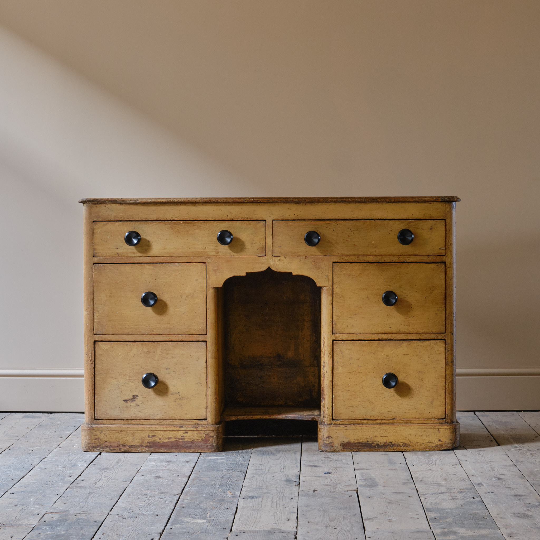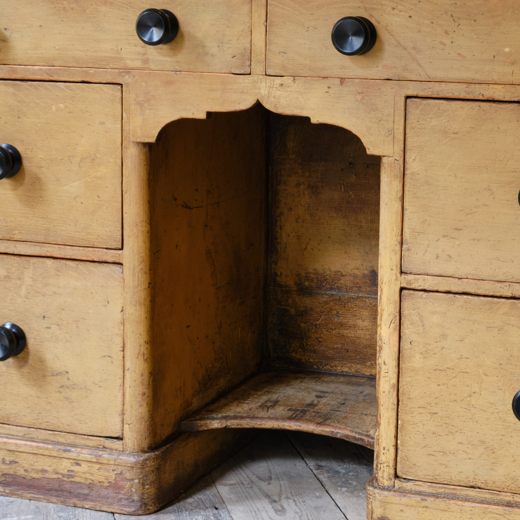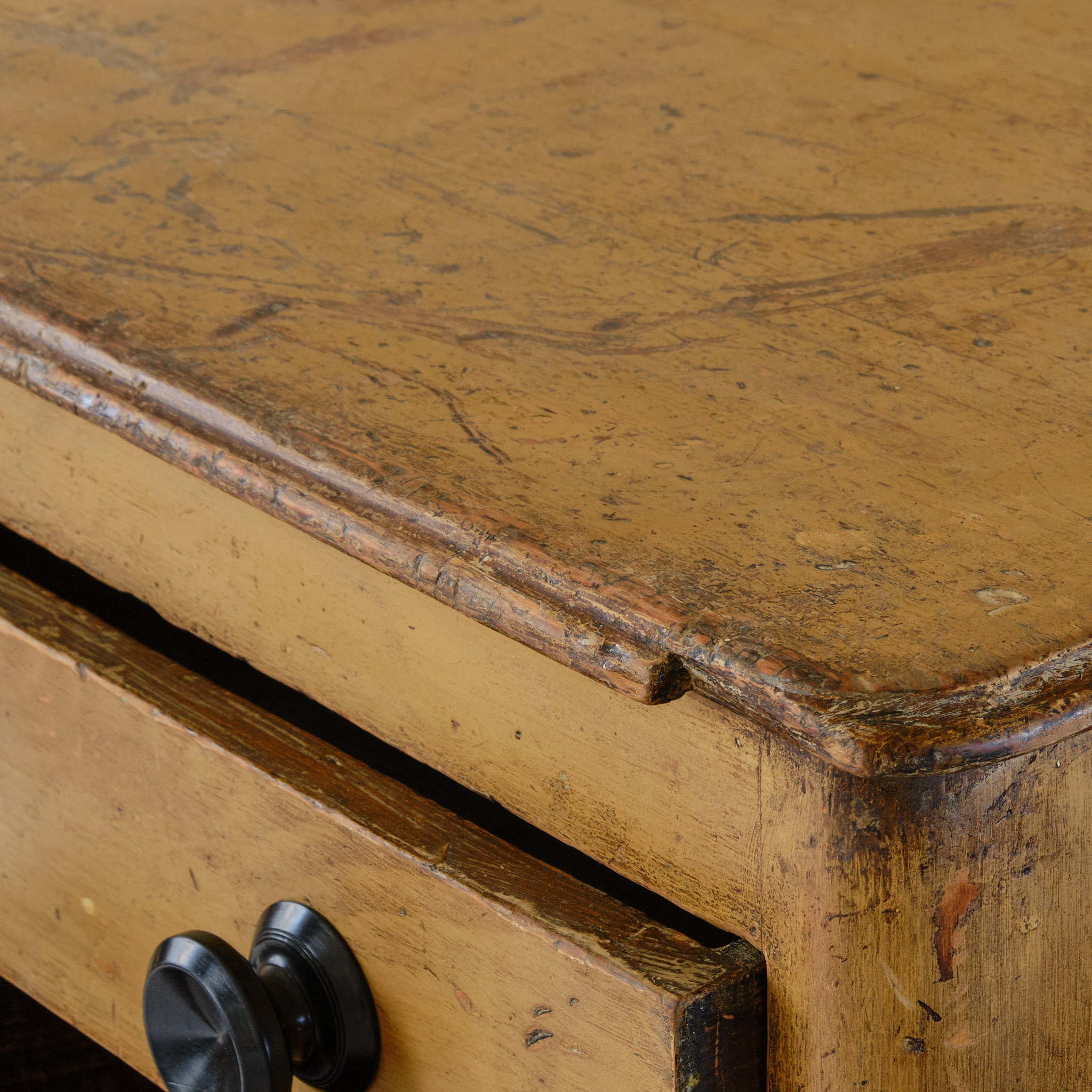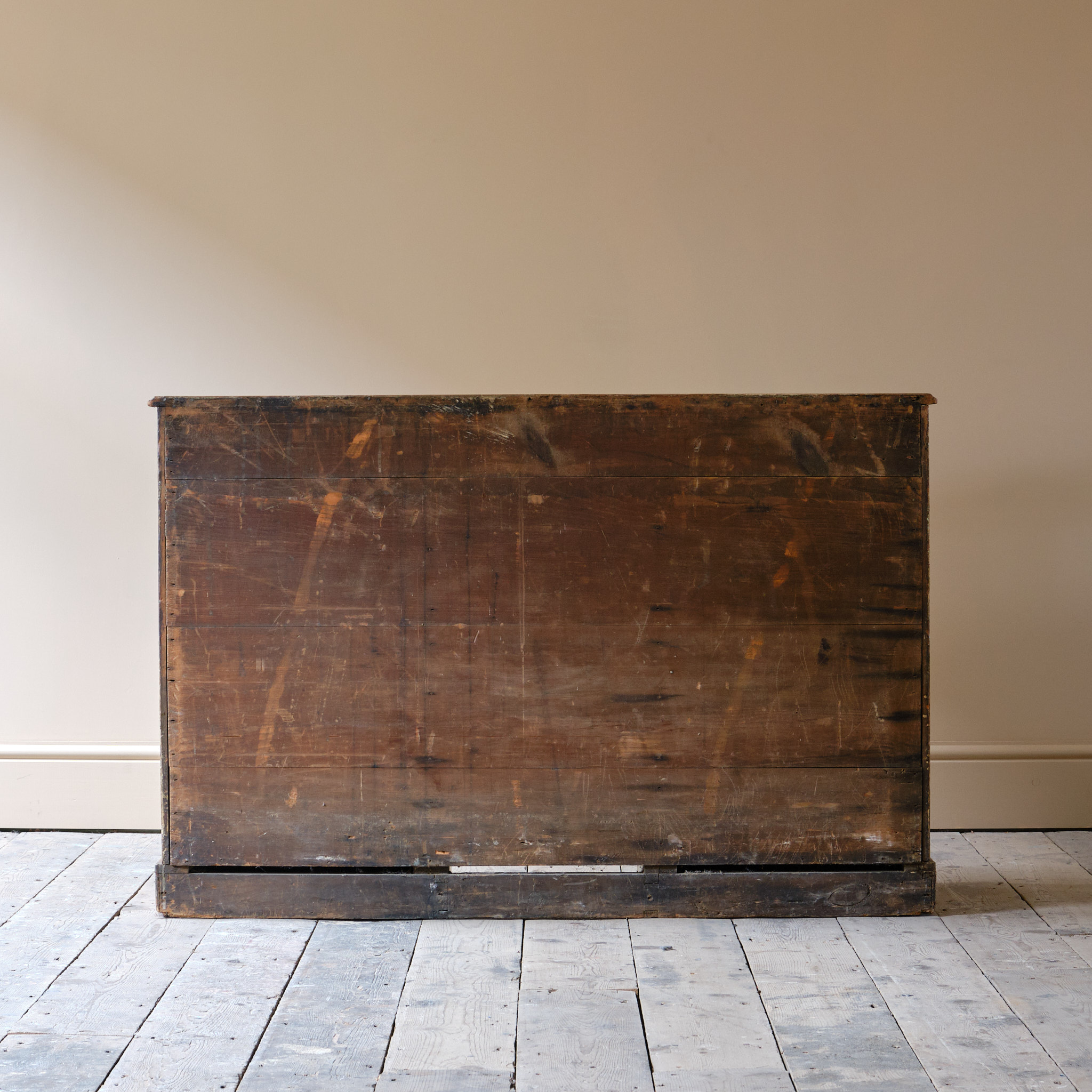 A mid 19th century dog kennel dresser base in its original cream paint with faded simulated oak graining. The 6 drawers with ebonized pulls all run well with one bottom drawer having historic repair as seen in the images.