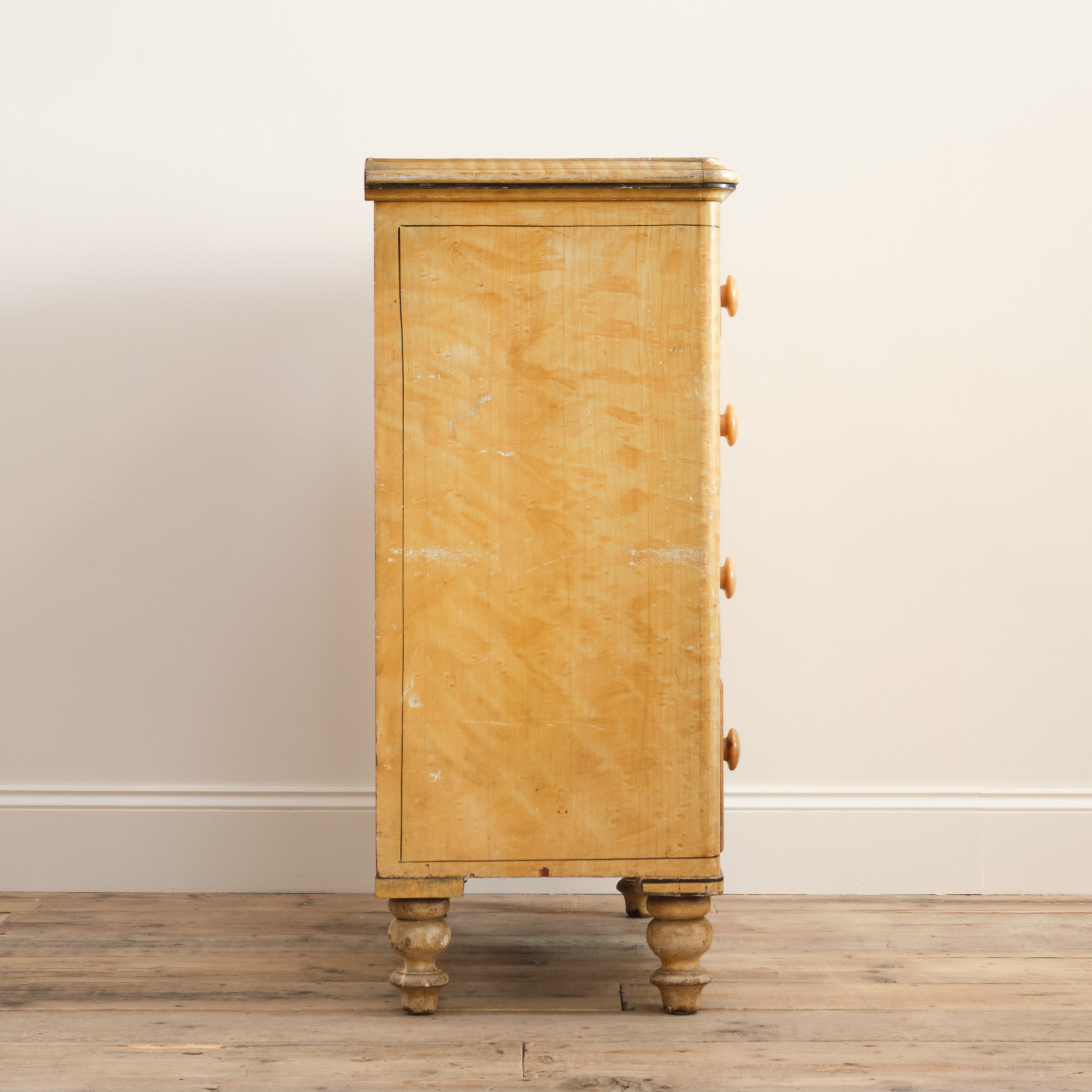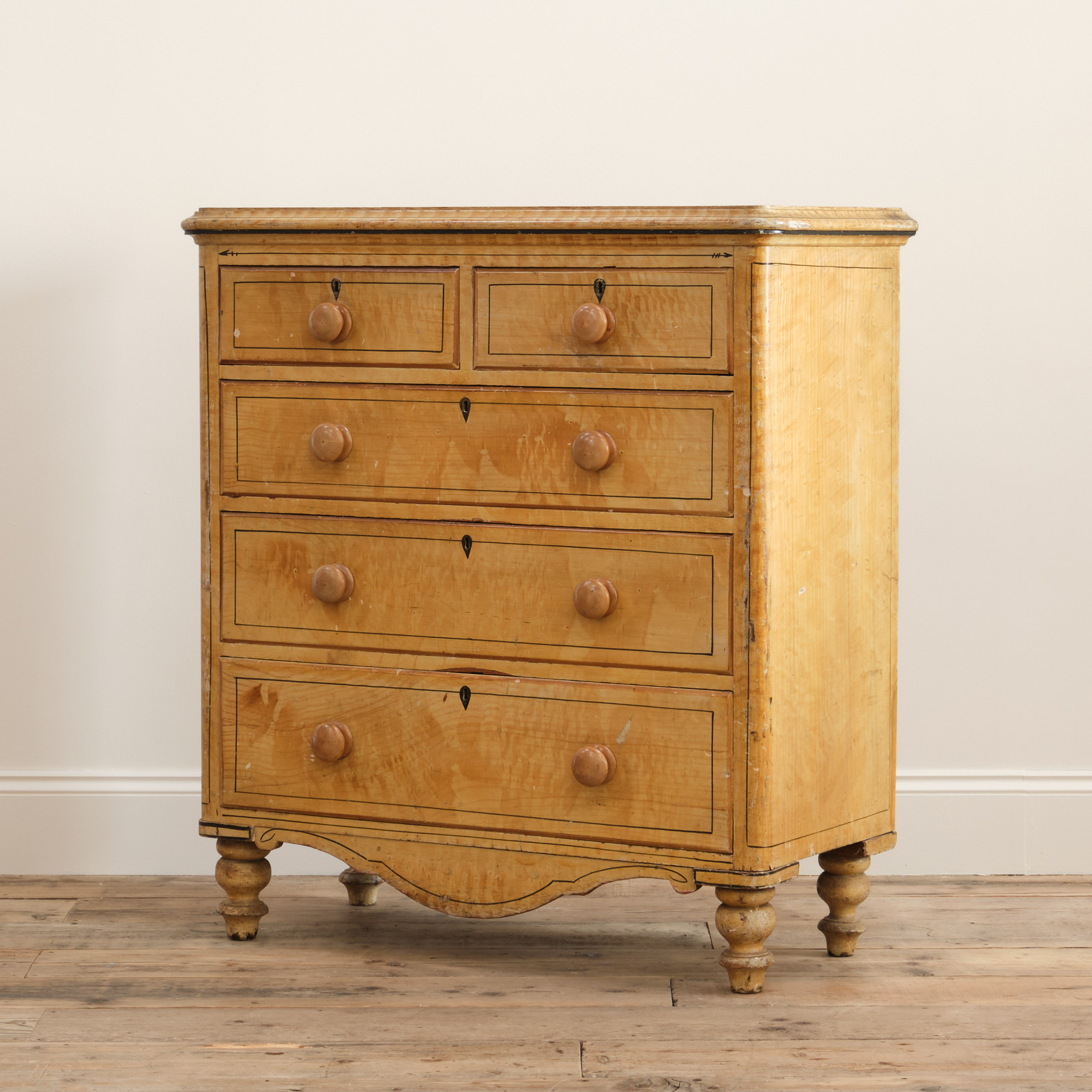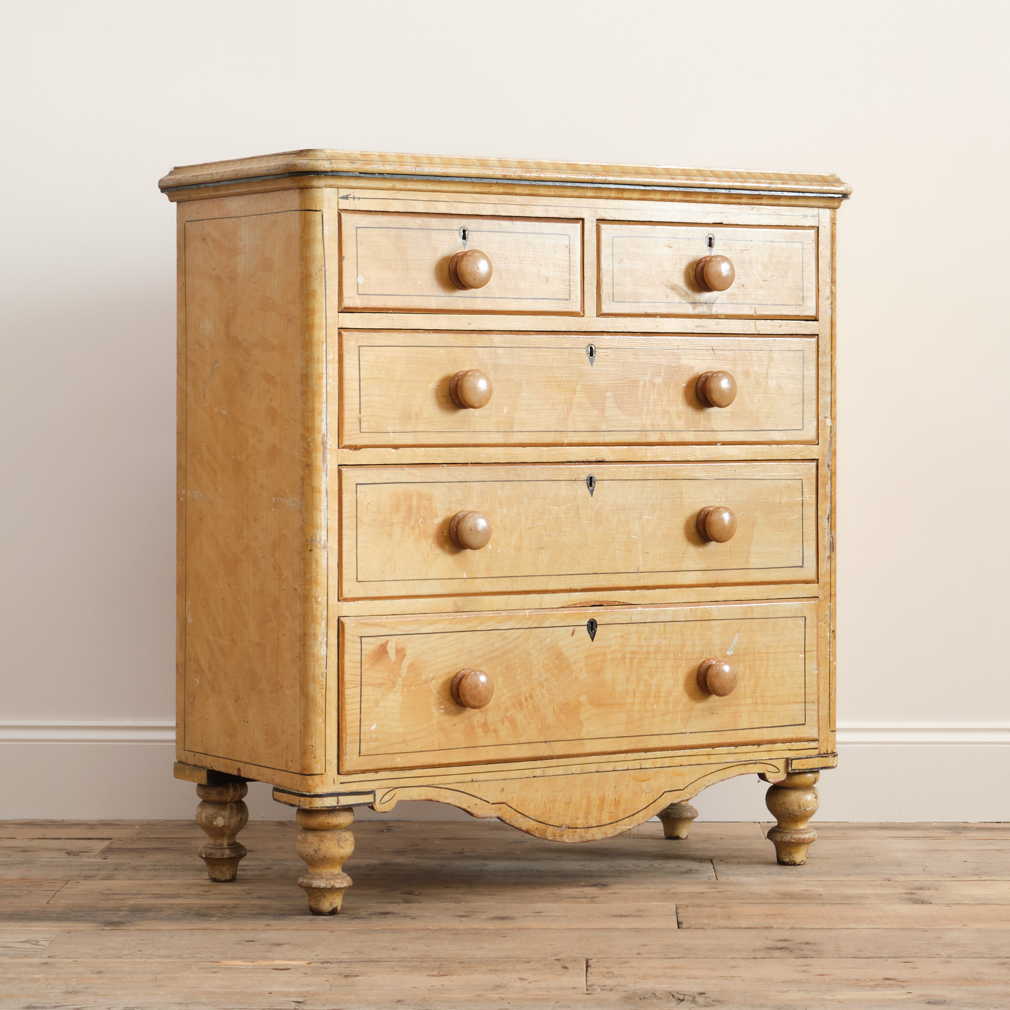 A 19th century pine chest of drawers in the original simulated Birdseye maple painted finish and pin striped details. The drawers retain the original turned knobs and locks. Raised on turned 4 turned feet and with a nice front apron.