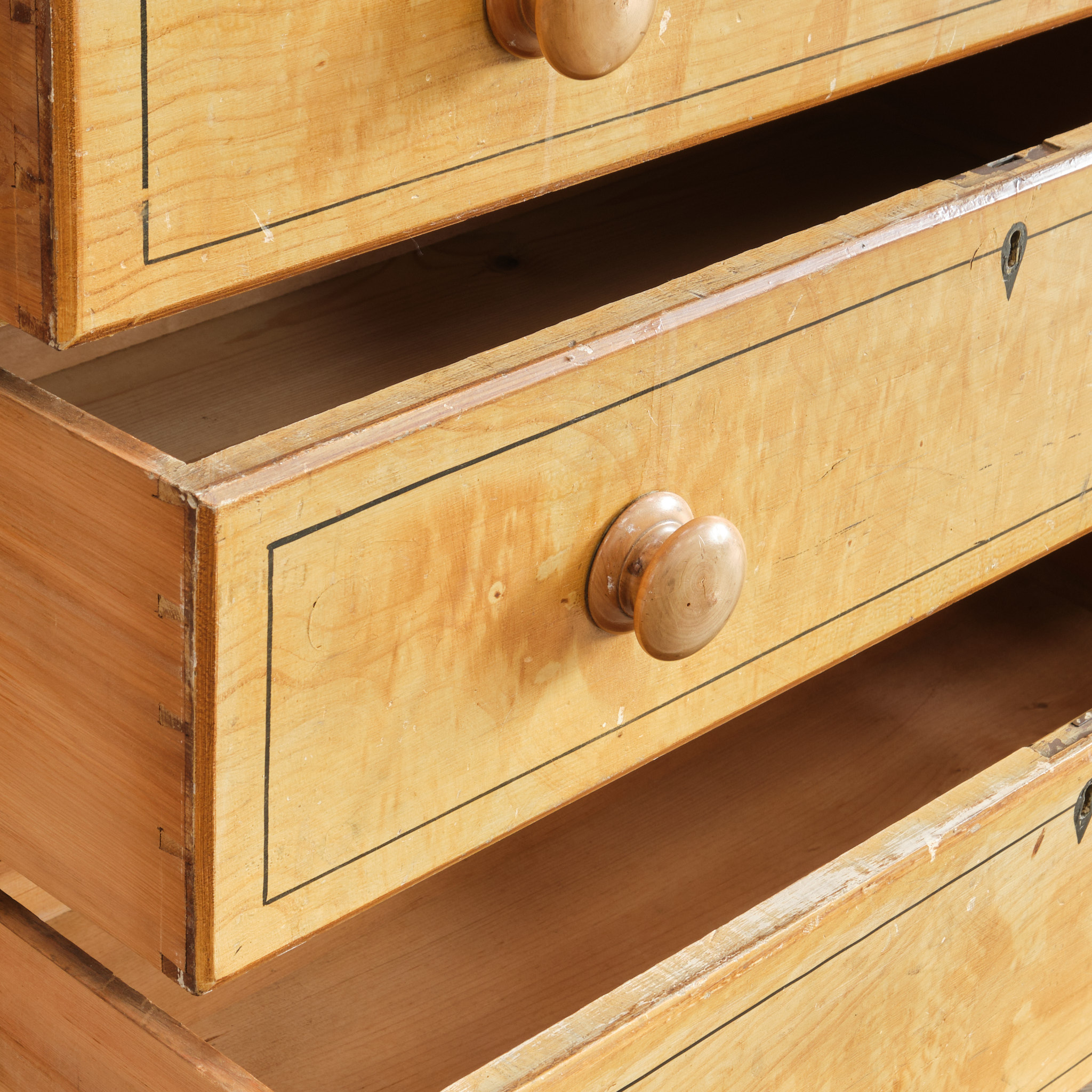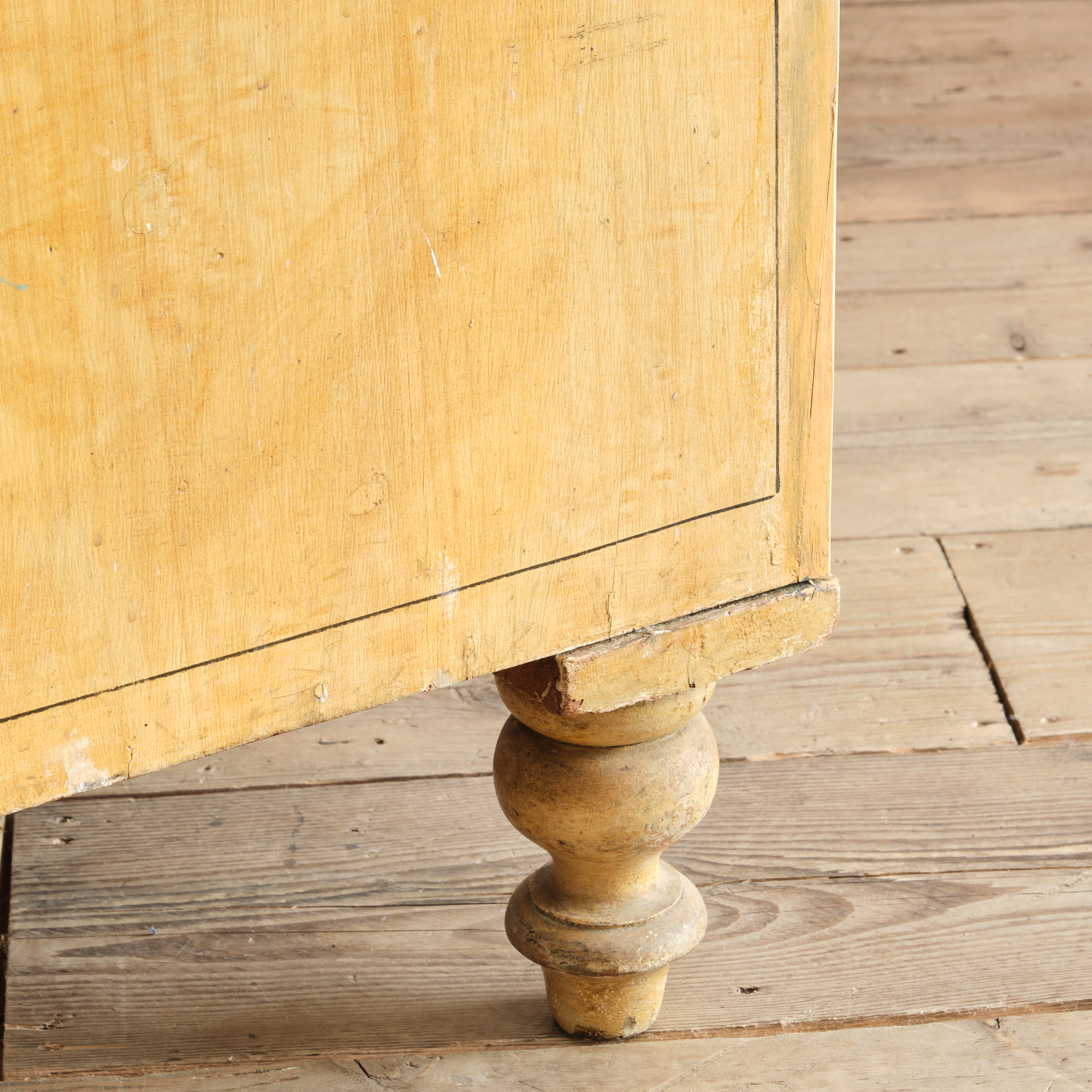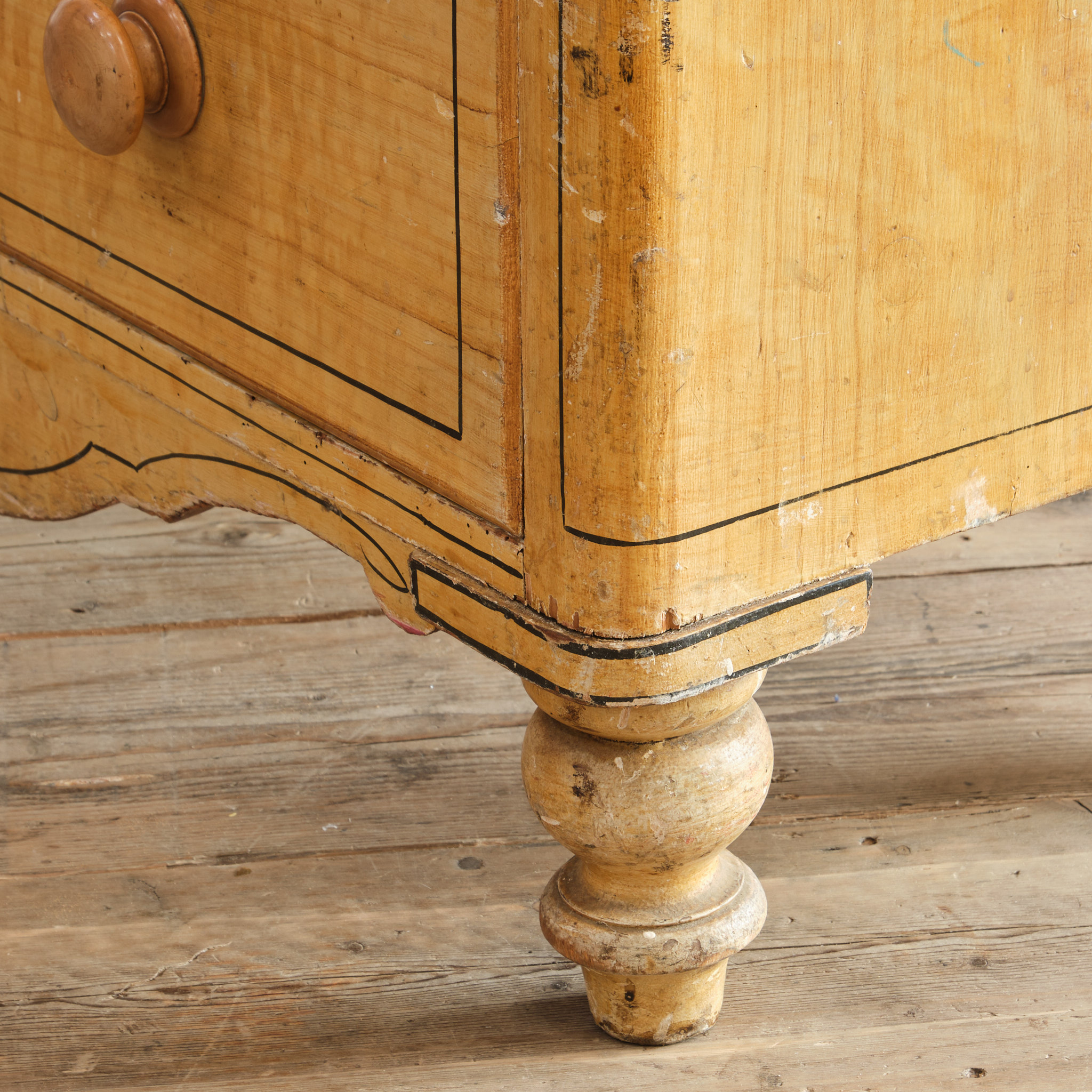 A 19th century pine chest of drawers in the original simulated Birdseye maple painted finish and pin striped details. The drawers retain the original turned knobs and locks. Raised on turned 4 turned feet and with a nice front apron.