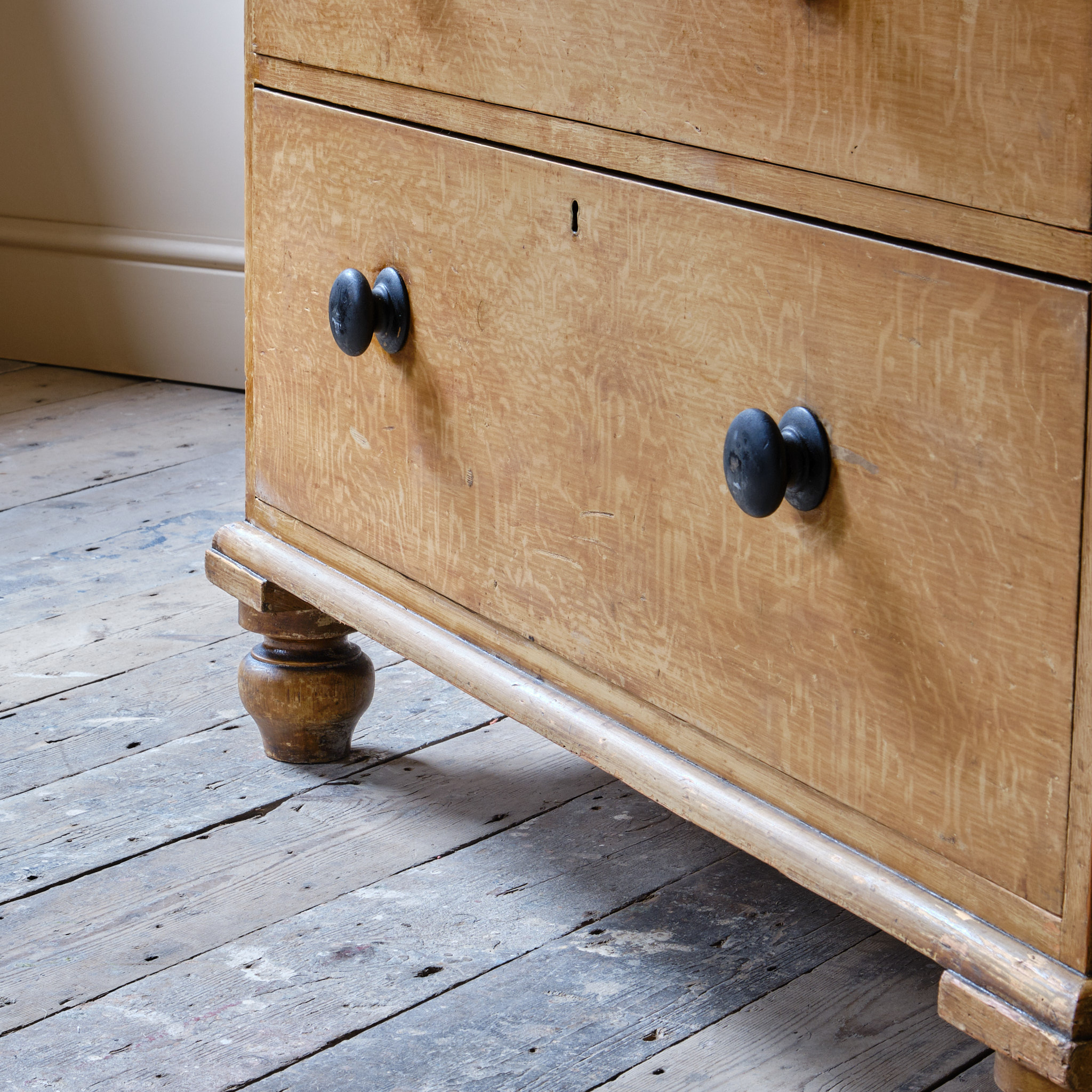 A large 19th Century Pine chest of drawers in the original simulated oak paint. Two short drawers over 3 long graduated drawers. Raised on turned feet and the drawers with the original ebonized handles.