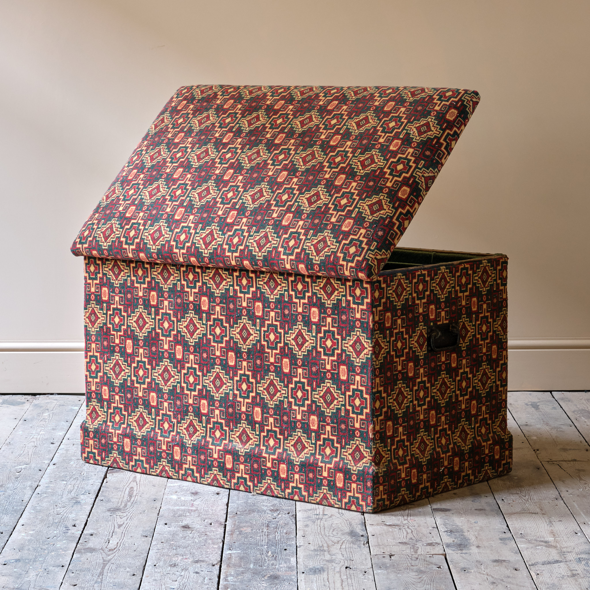 A large 19th century pine storage box in later thick carpet type material and a green baize lined interior with compartmental storage bays. The main body of the box with iron carry handles and the top with horsehair upholstery.