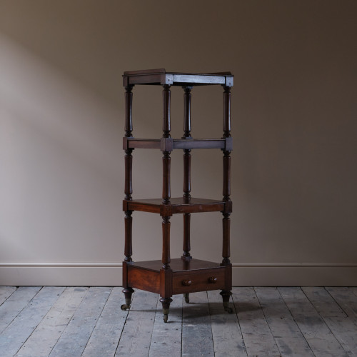 A good mid 19th century mahogany waterfall bookcase. Raised on turned legs and the original good quality brass casters. Nice wear and patina throughout and a decorative leather trim.