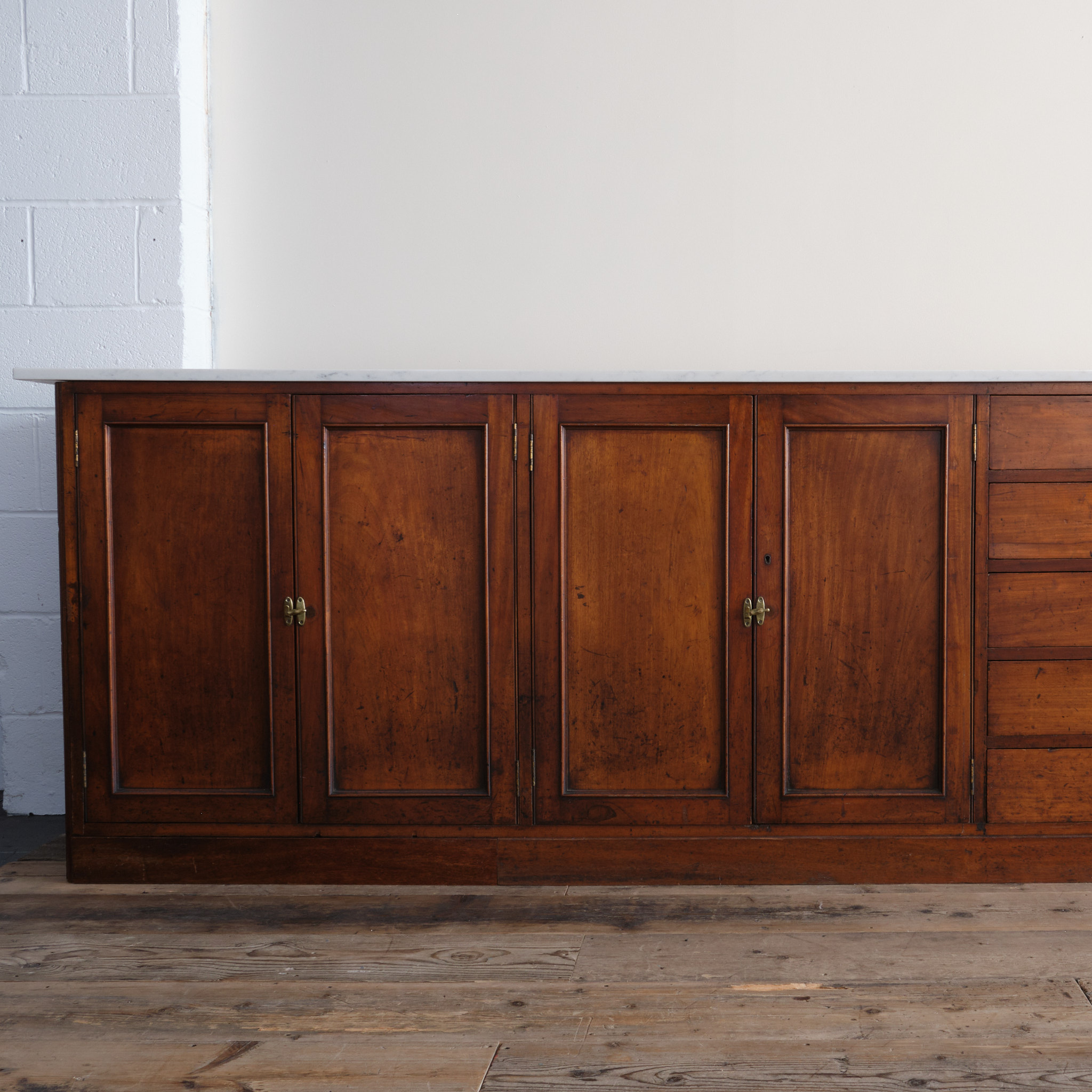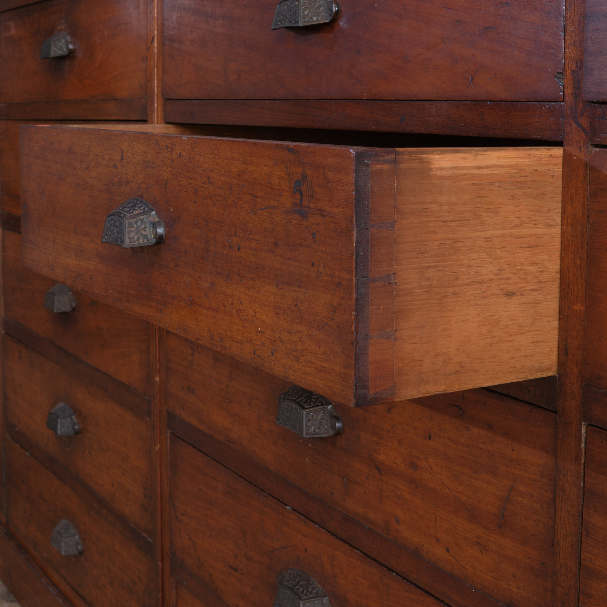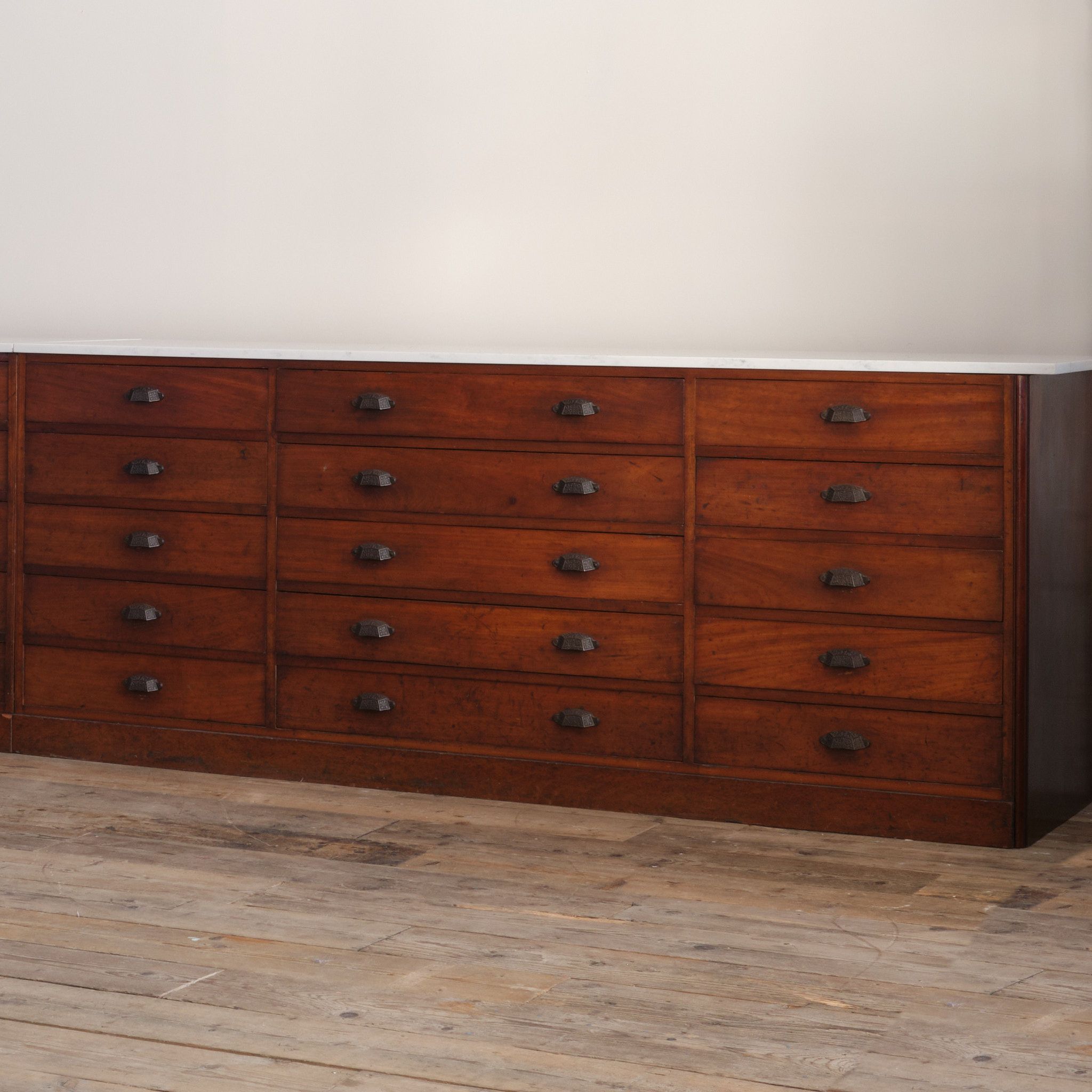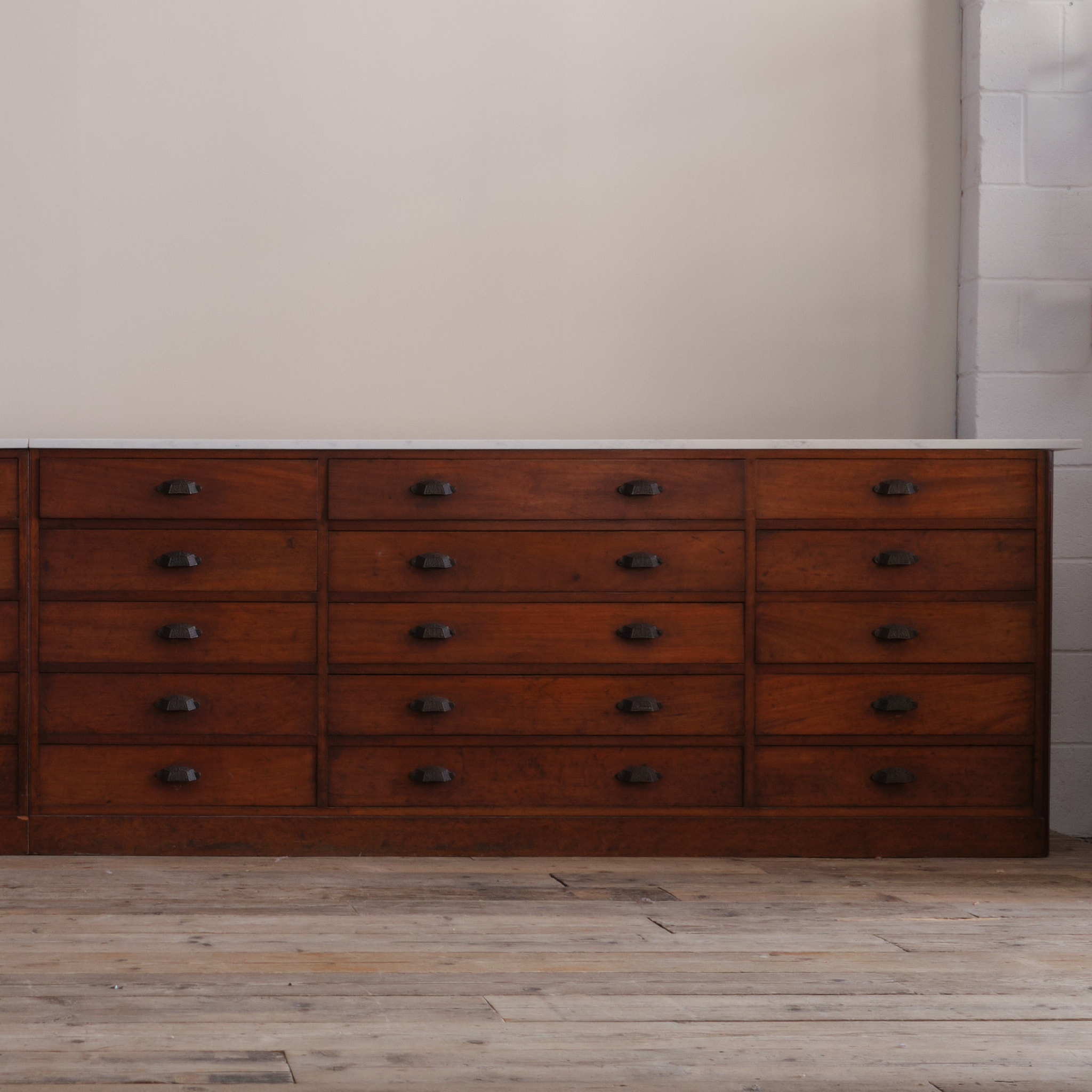 The unit comprising of 2 large free standing units with. One with 15 drawers and the other with 5 drawers and 2 large shelved cupboards and all the drawers retaining the original cast iron cup handles.