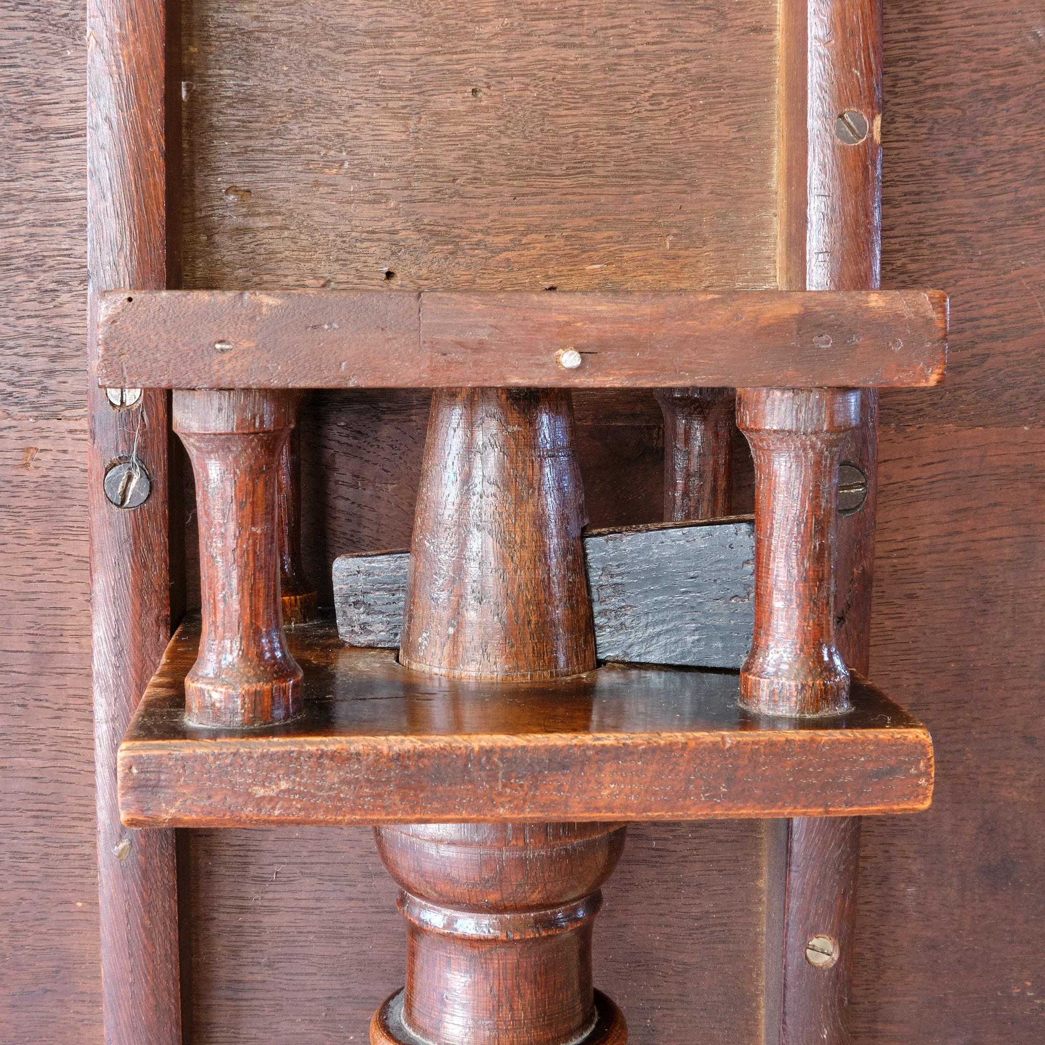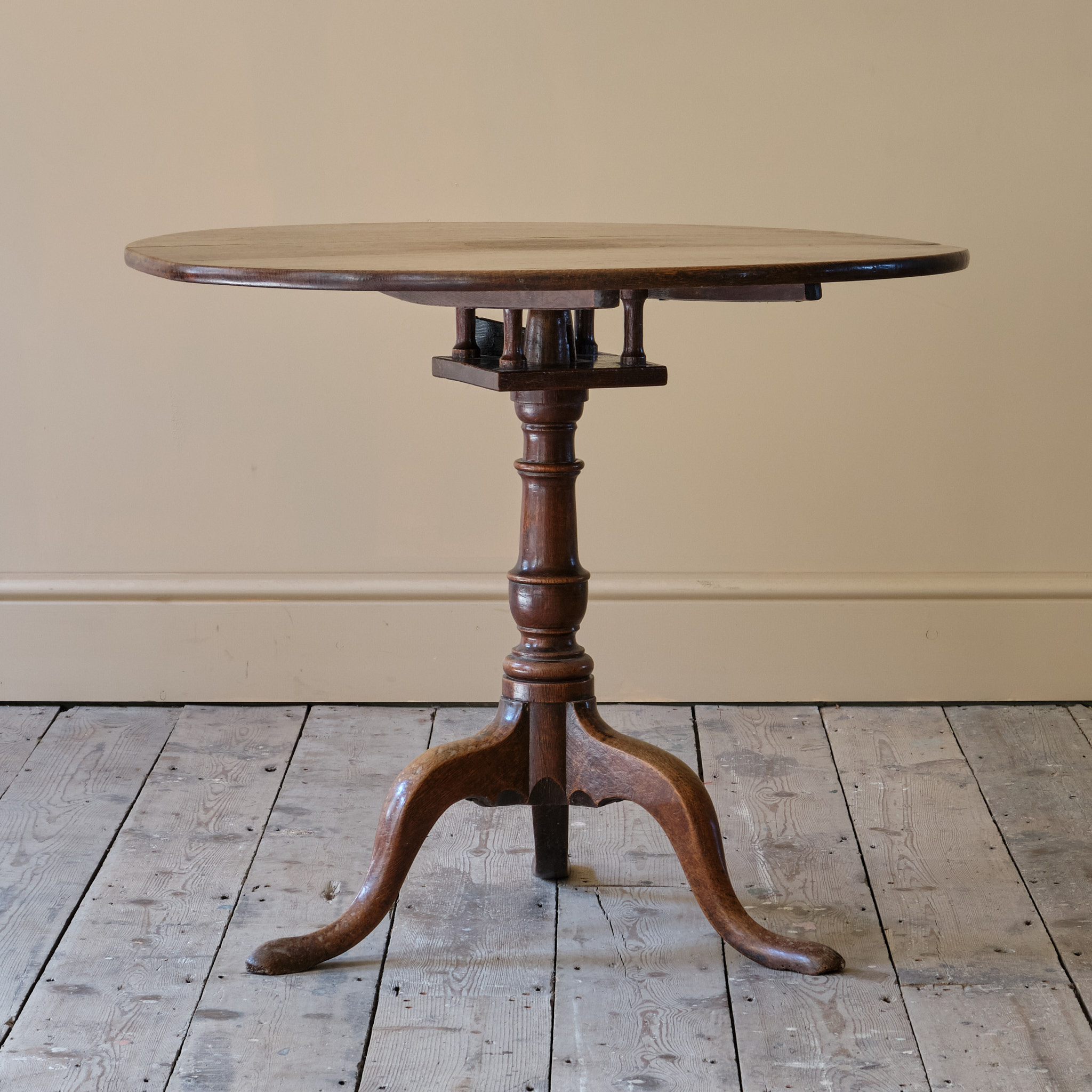 A vernacular tilt top birdcage pedestal table. Constructed in oak with with a turned stem above 3 shaped legs. The top with its original catch. The birdcage mechanism allows the top to spin on its axis and is held in place with a removable peg.