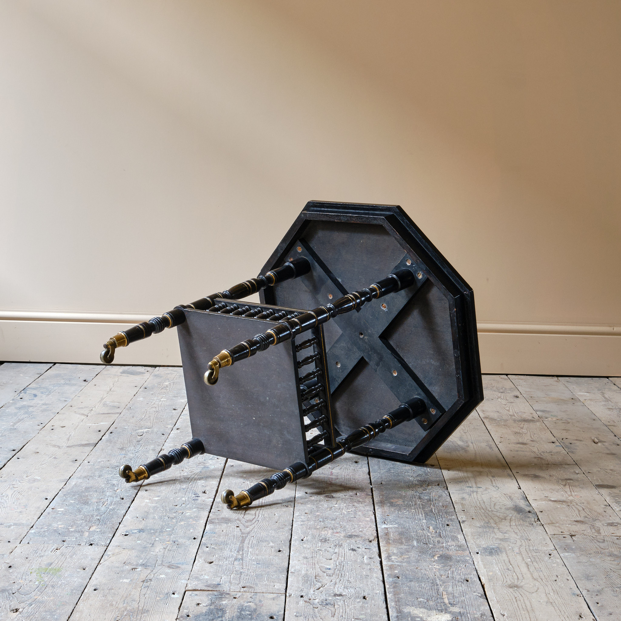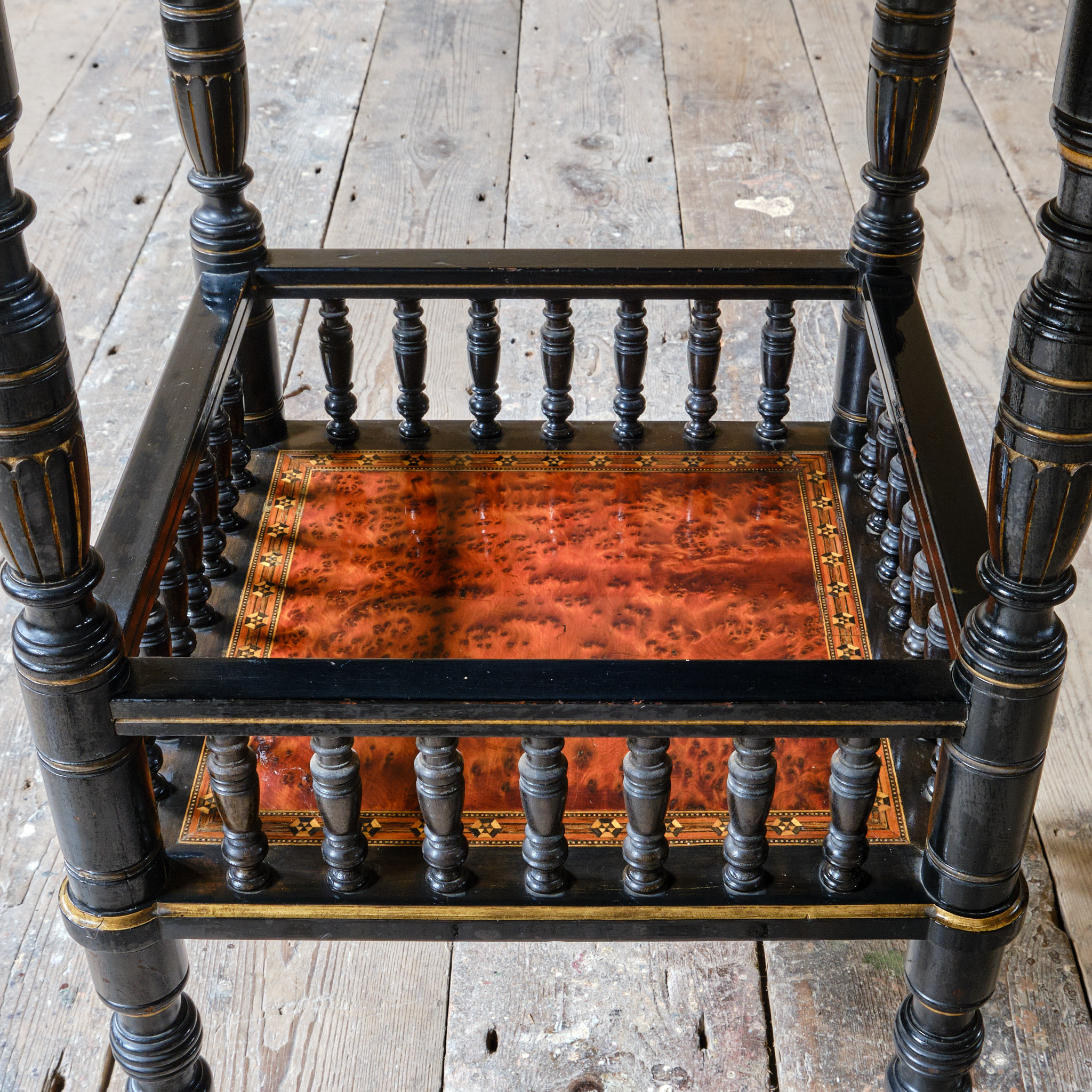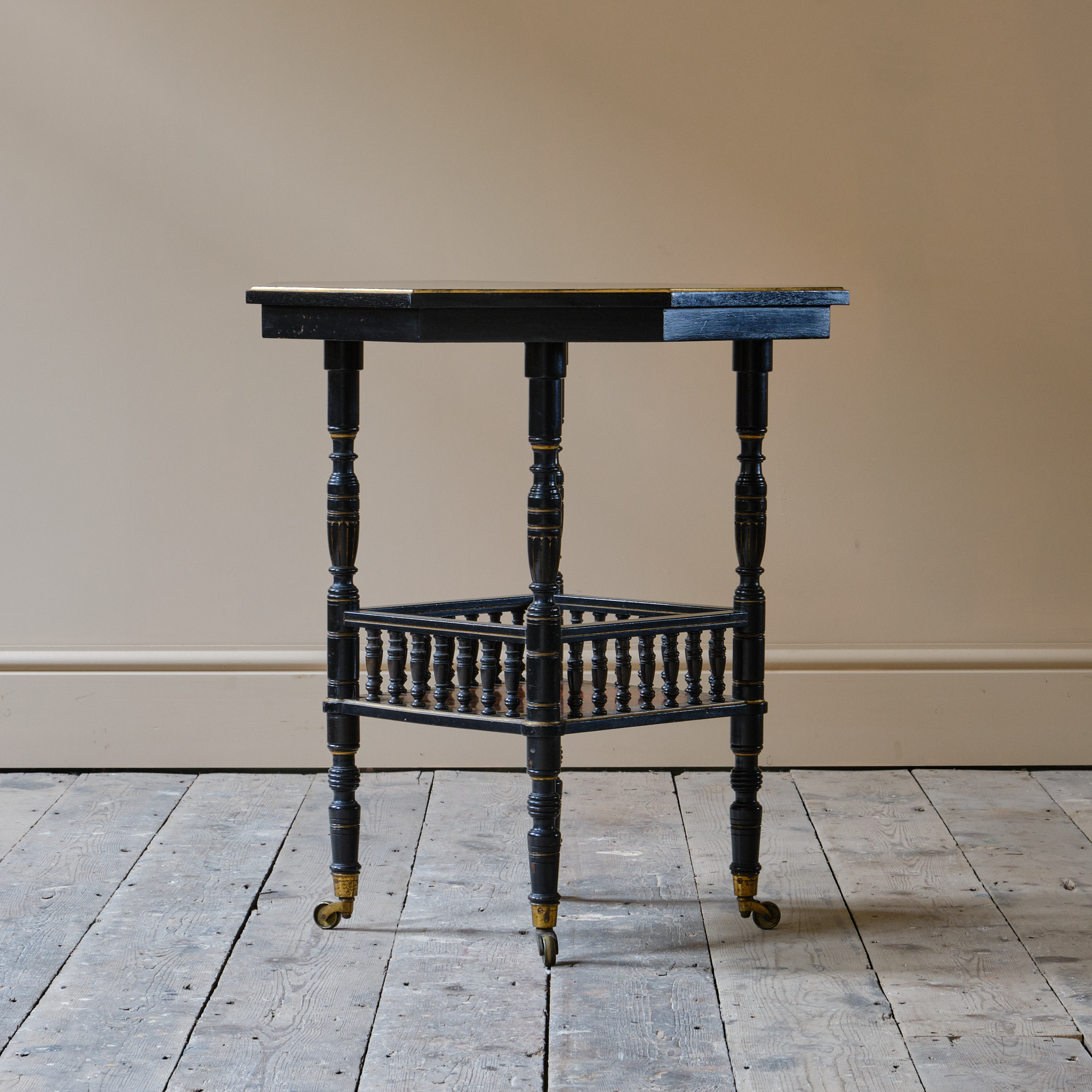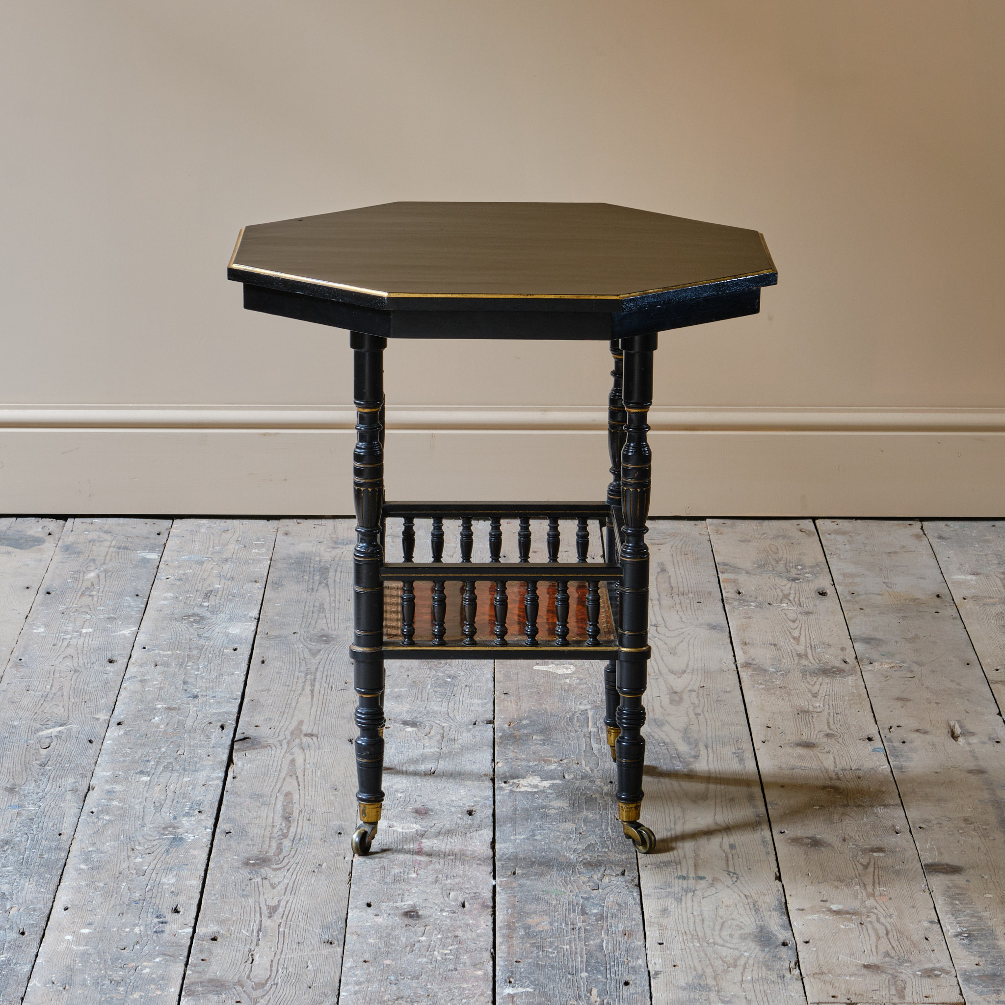 A good quality English Aesthetic Movement side table Attributed to Gillows. The ebonized and gilt octagonal top above a lower shelf with turned spindles and Amboyna and inlaid banding. The whole raised on turned supports and the original Cope & Collinson brass casters. The underside of the top stamped L5669