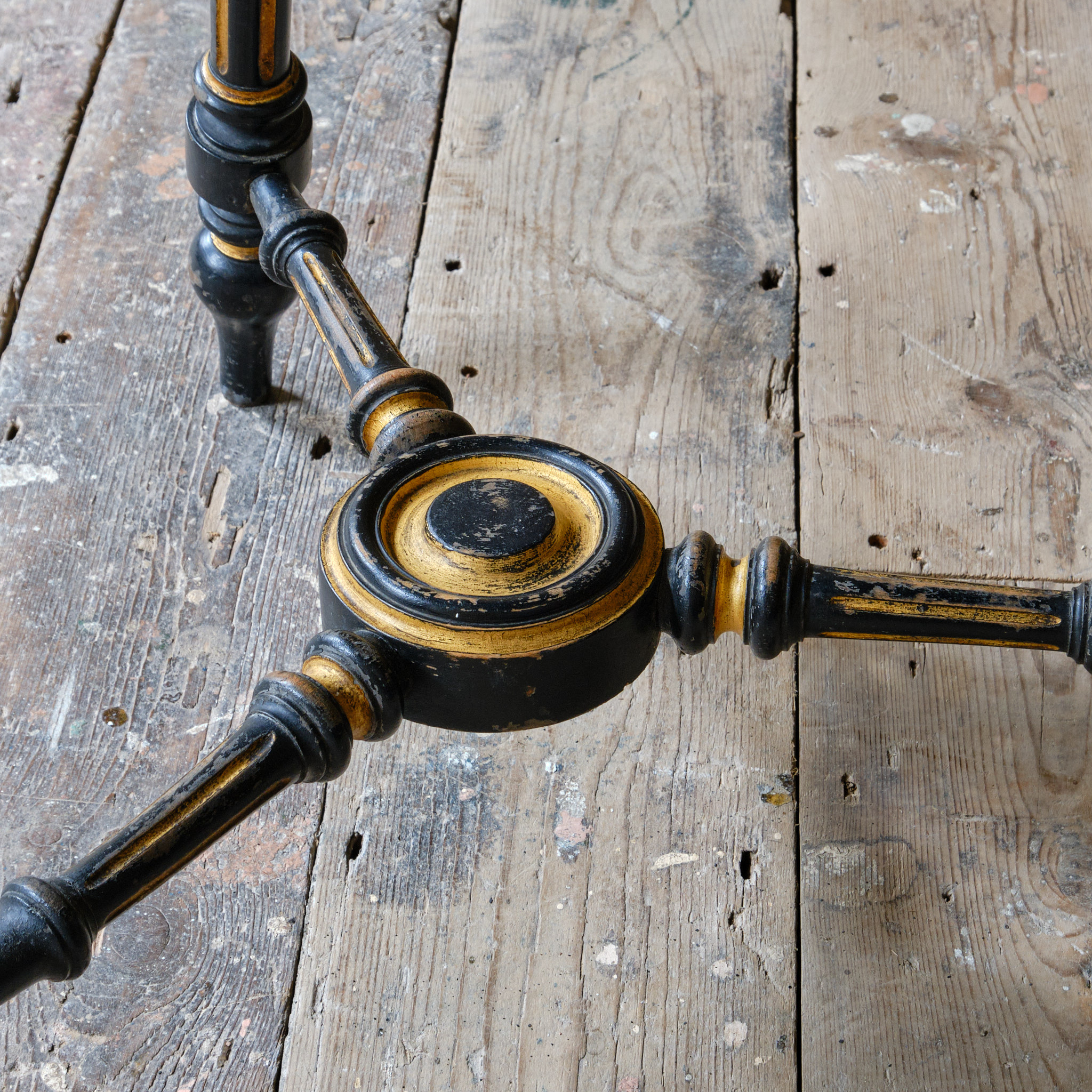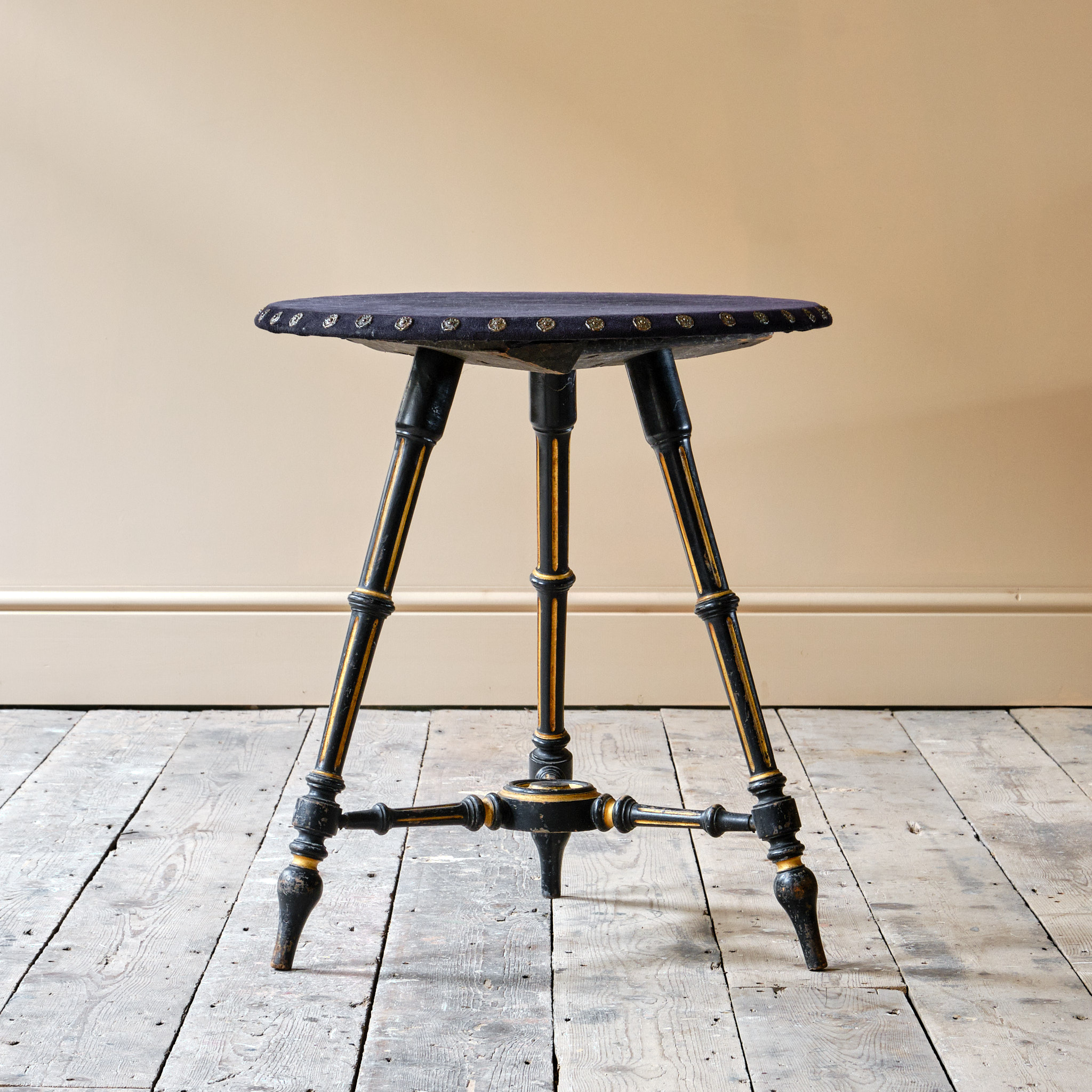 A 19th century Aesthetic Movement side table. The ebonized and gilt base with a velvet top and antique studs. English c1870