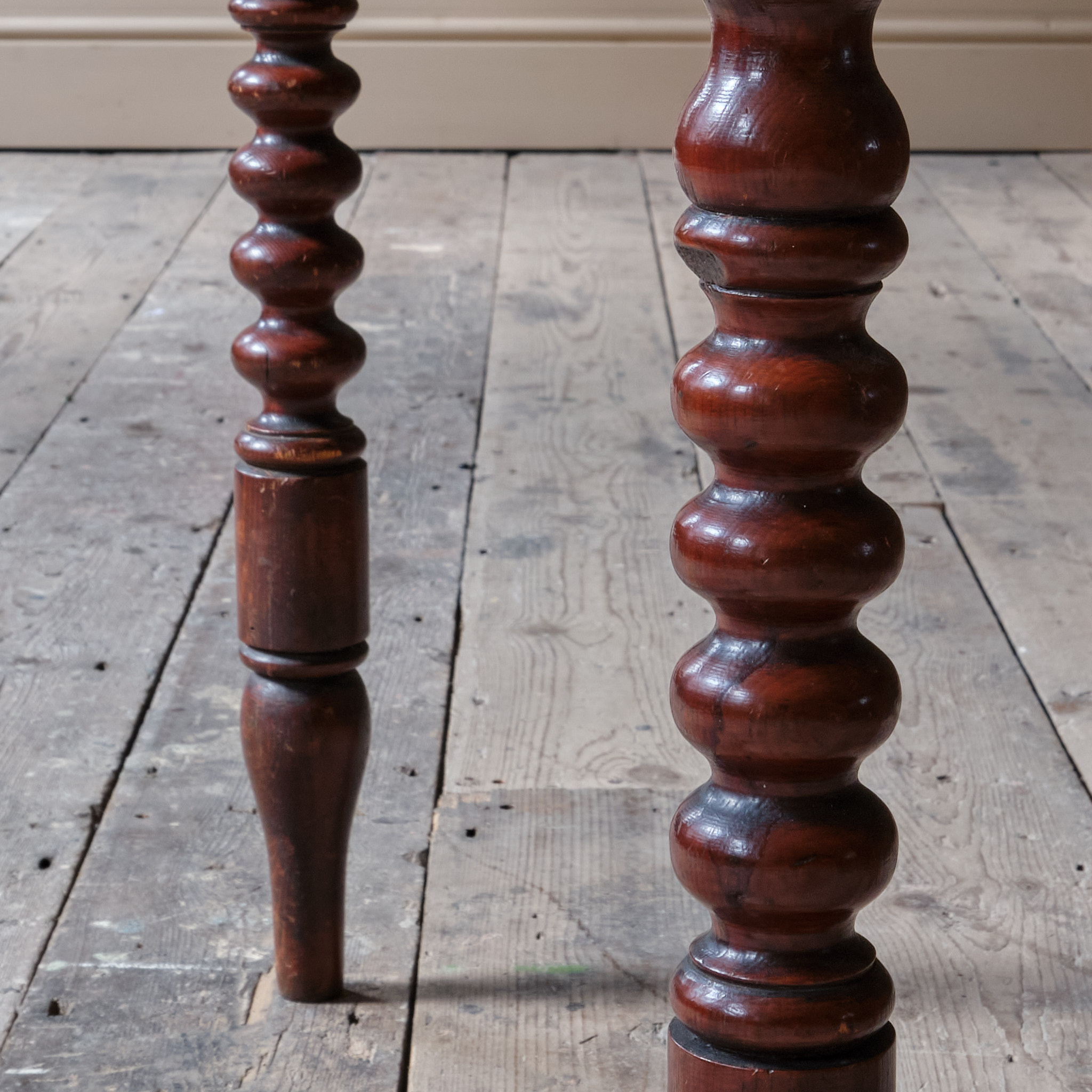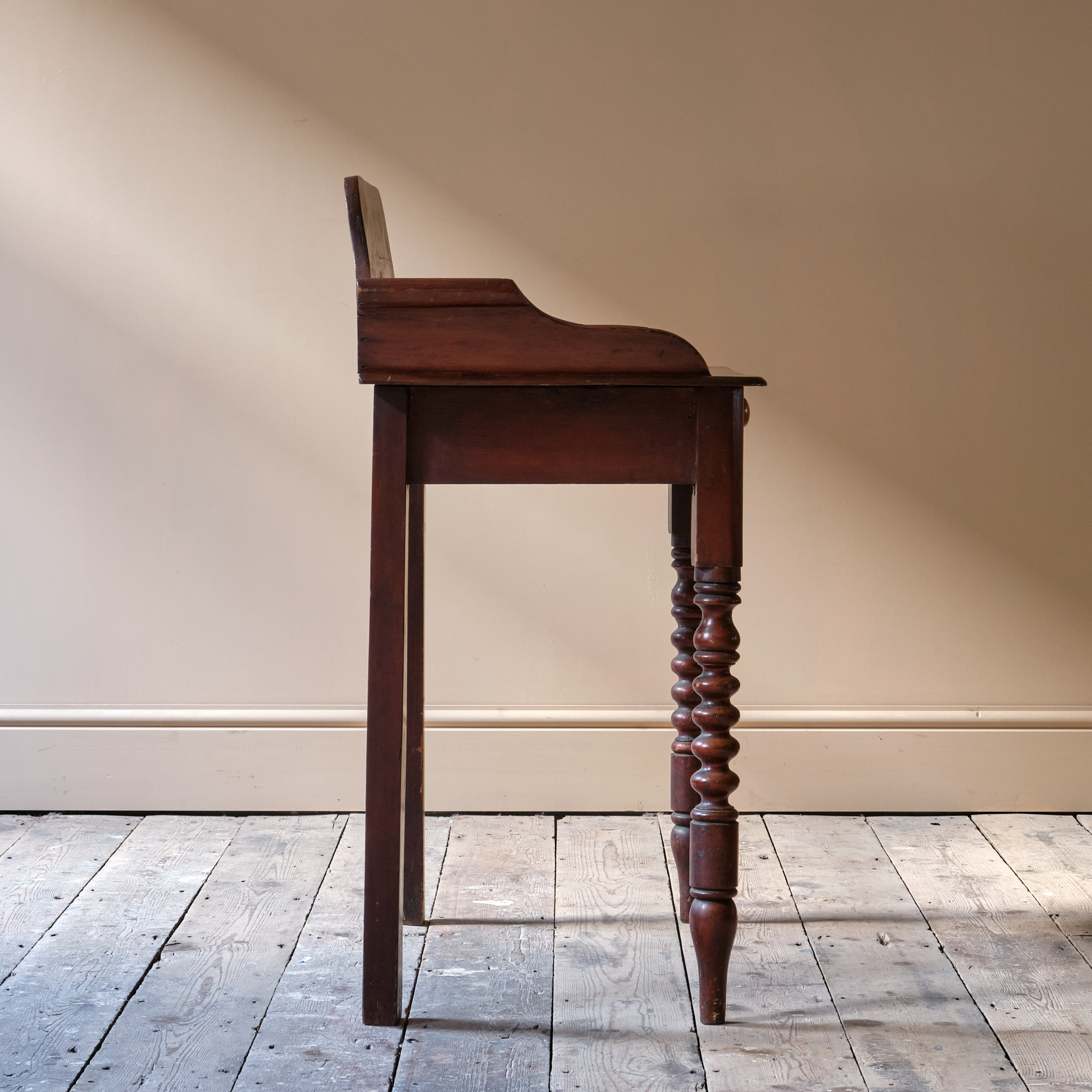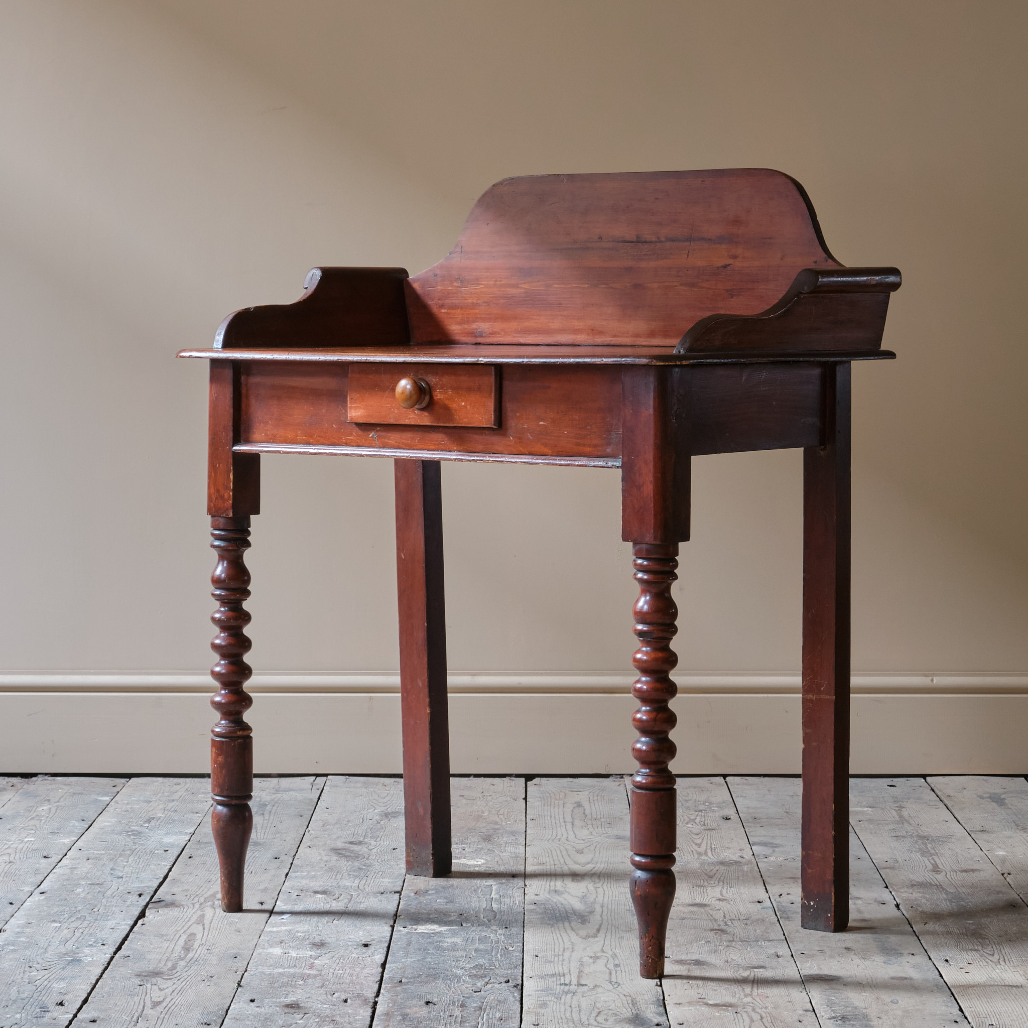 A small and elegant 19th century stained pine washstand. Raised on bobbin turned front legs and square back legs. Having a small single drawer and shaped gallery top.
