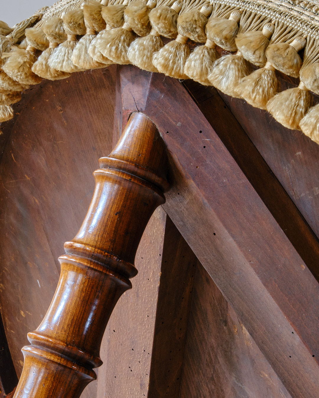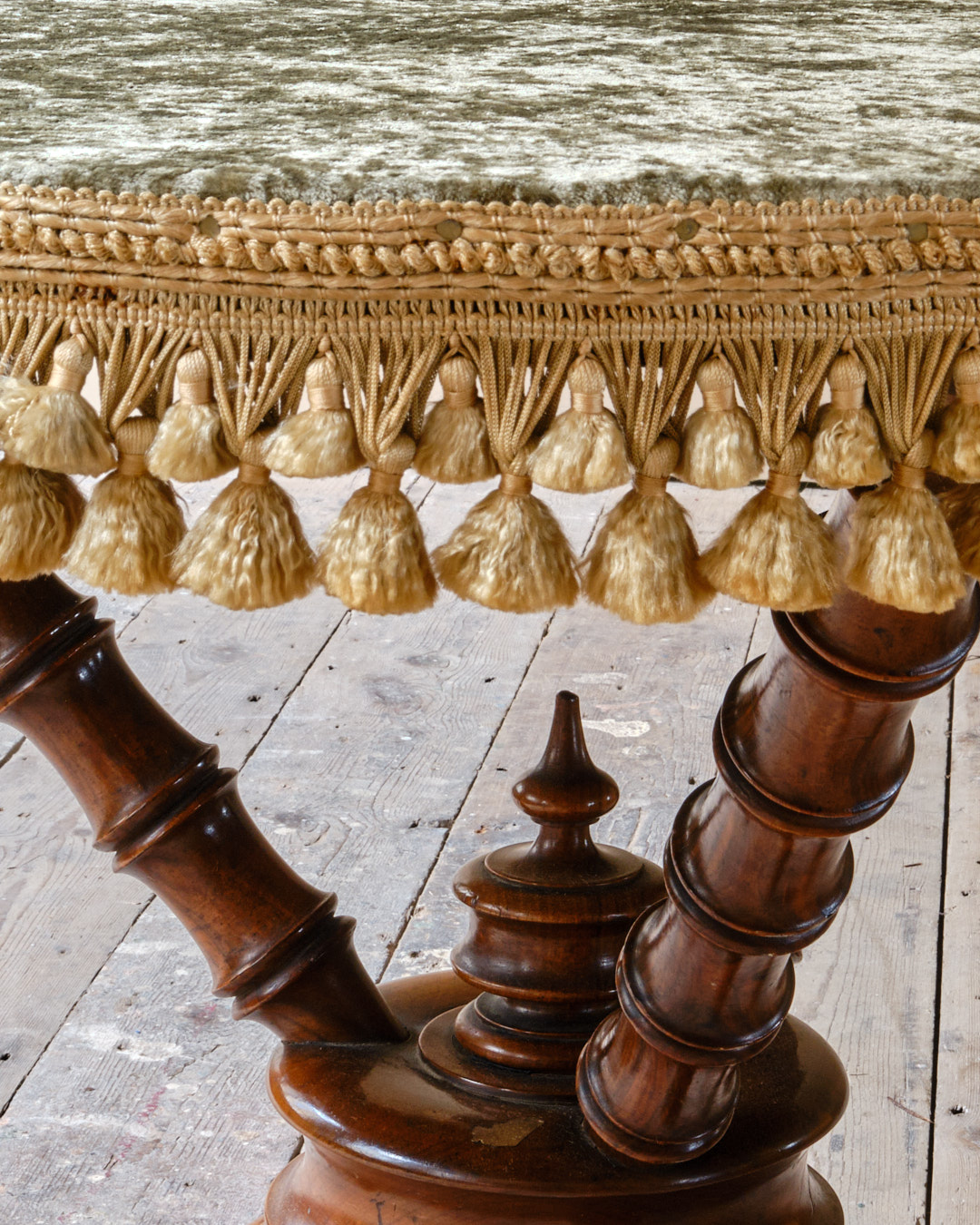 An attractively formed mid 19th century country house gypsy side table. The fruitwood base with simulated bamboo legs and supports. Recovered by us in antique velvet and trim salvaged from a pair of barrel back armchairs. A good useful size
