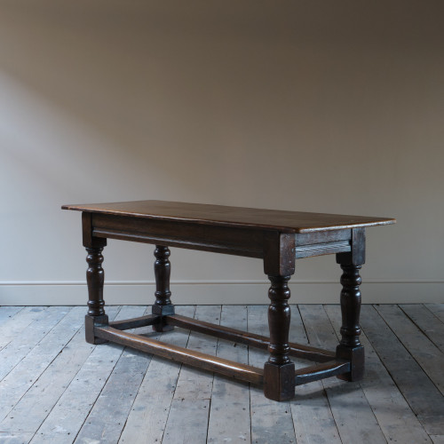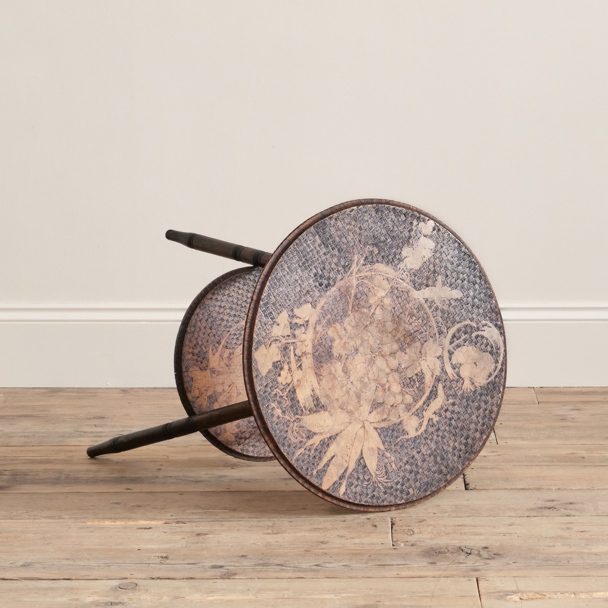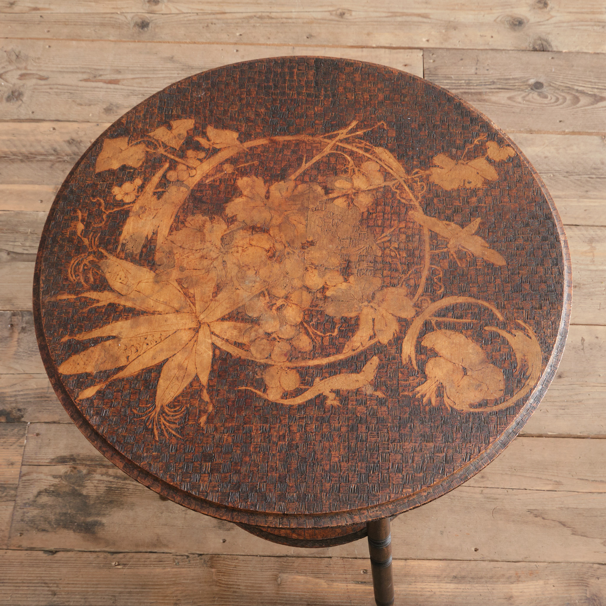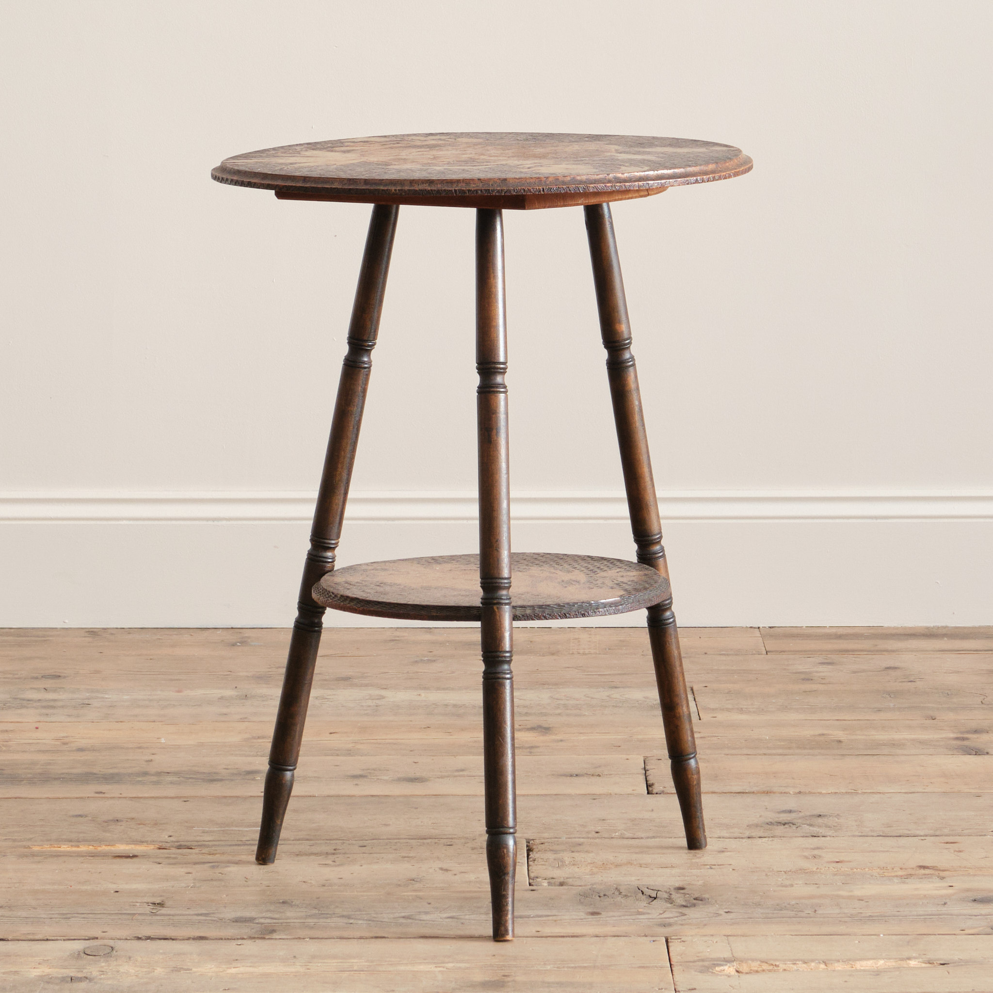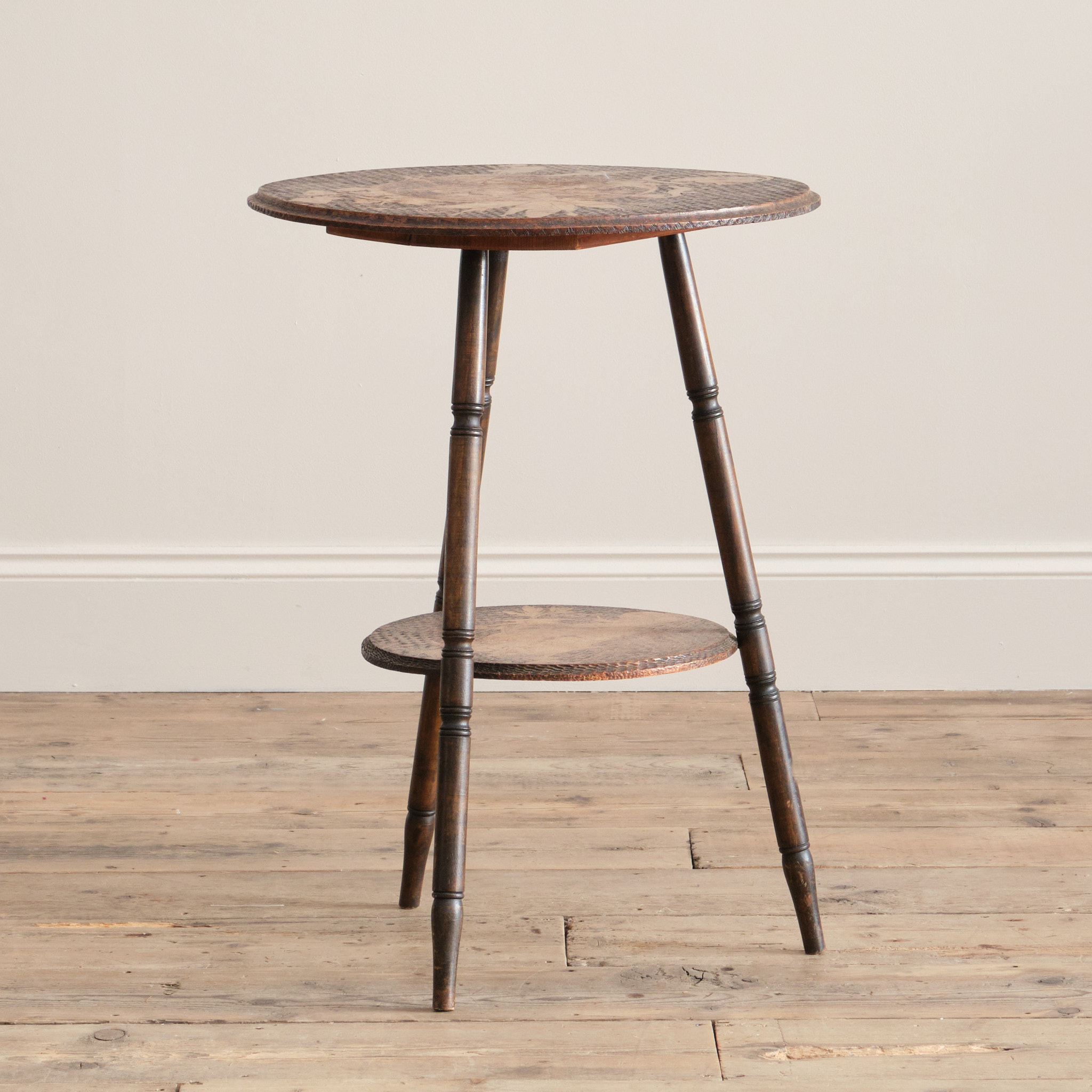 An early 20th century side table decorated with Poker Work on both top and bottom tiers. c1920