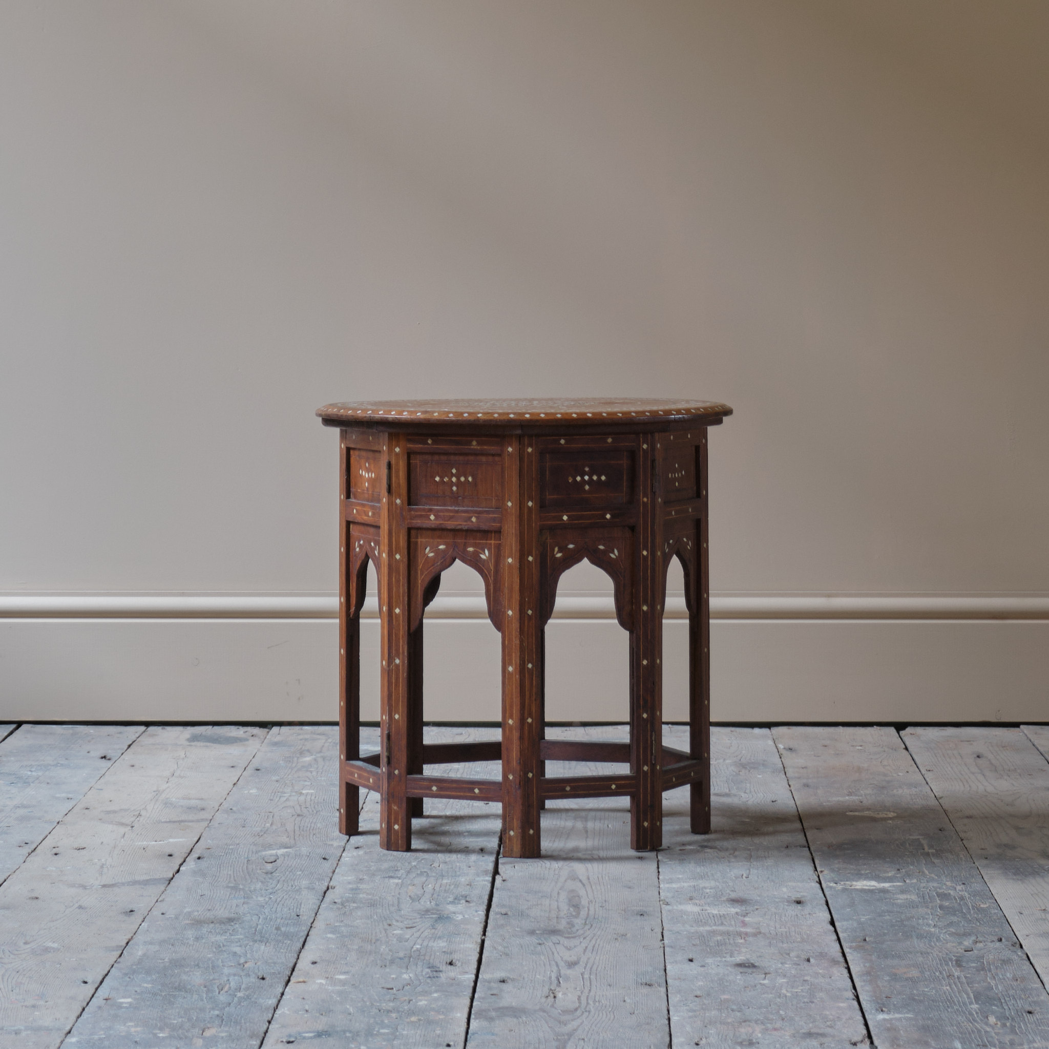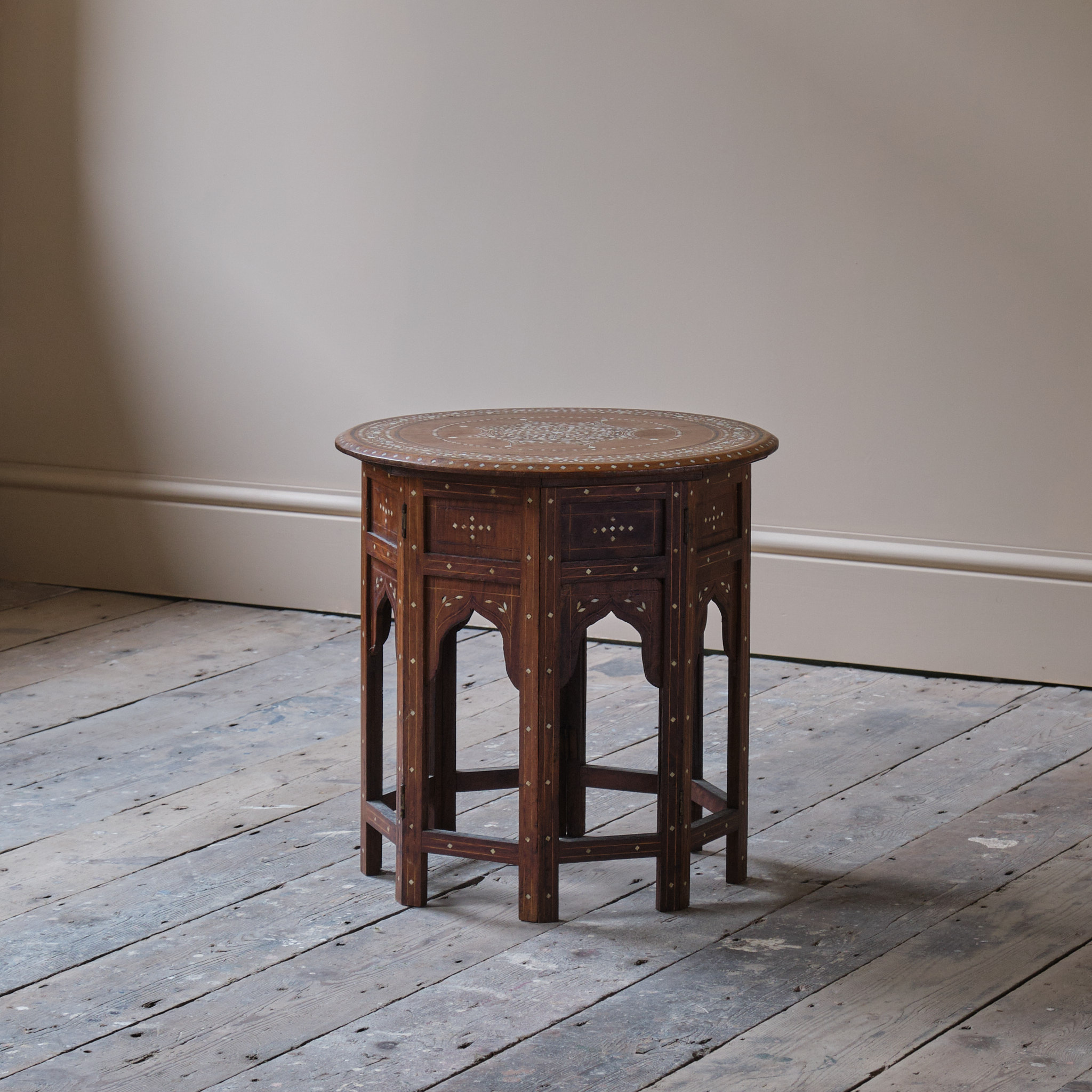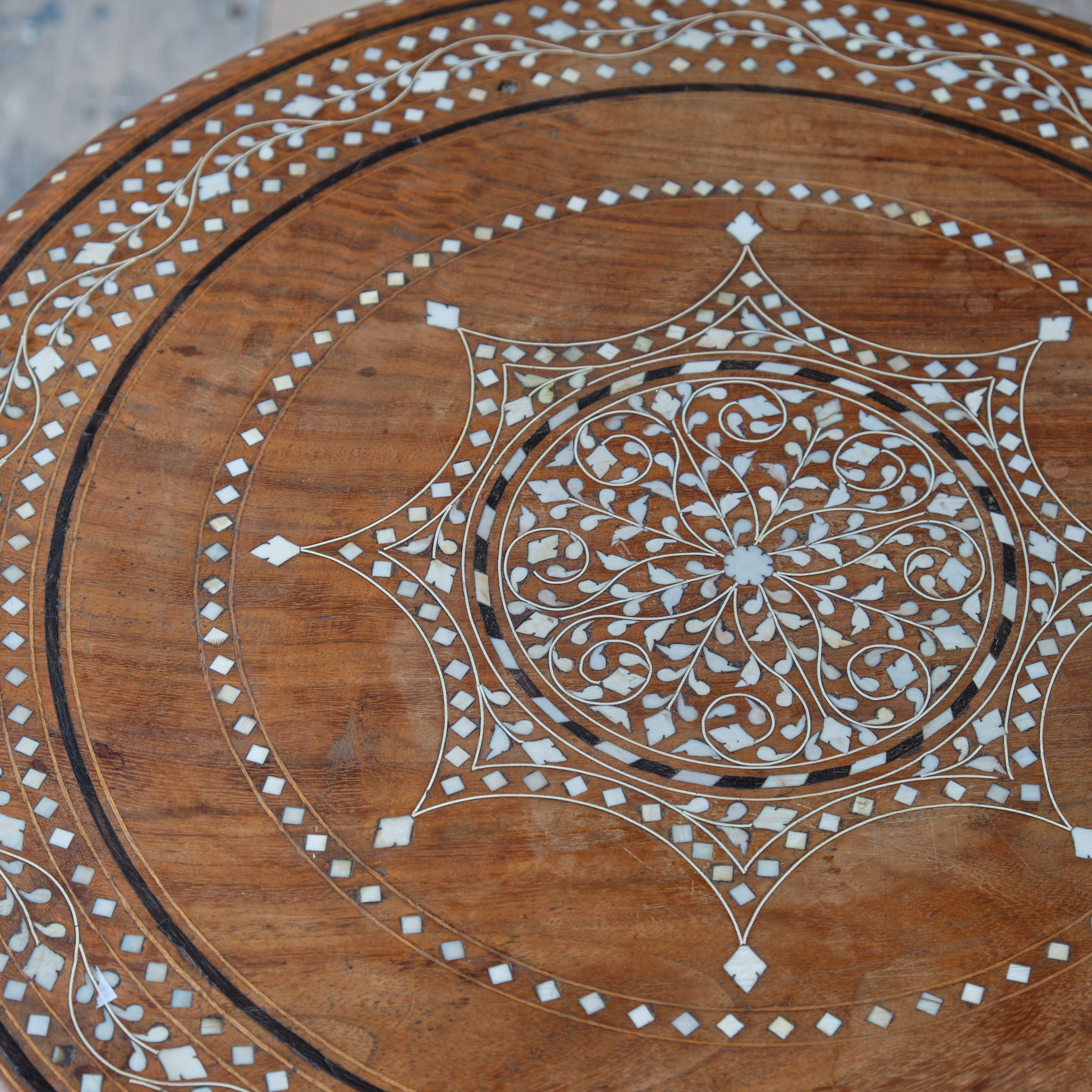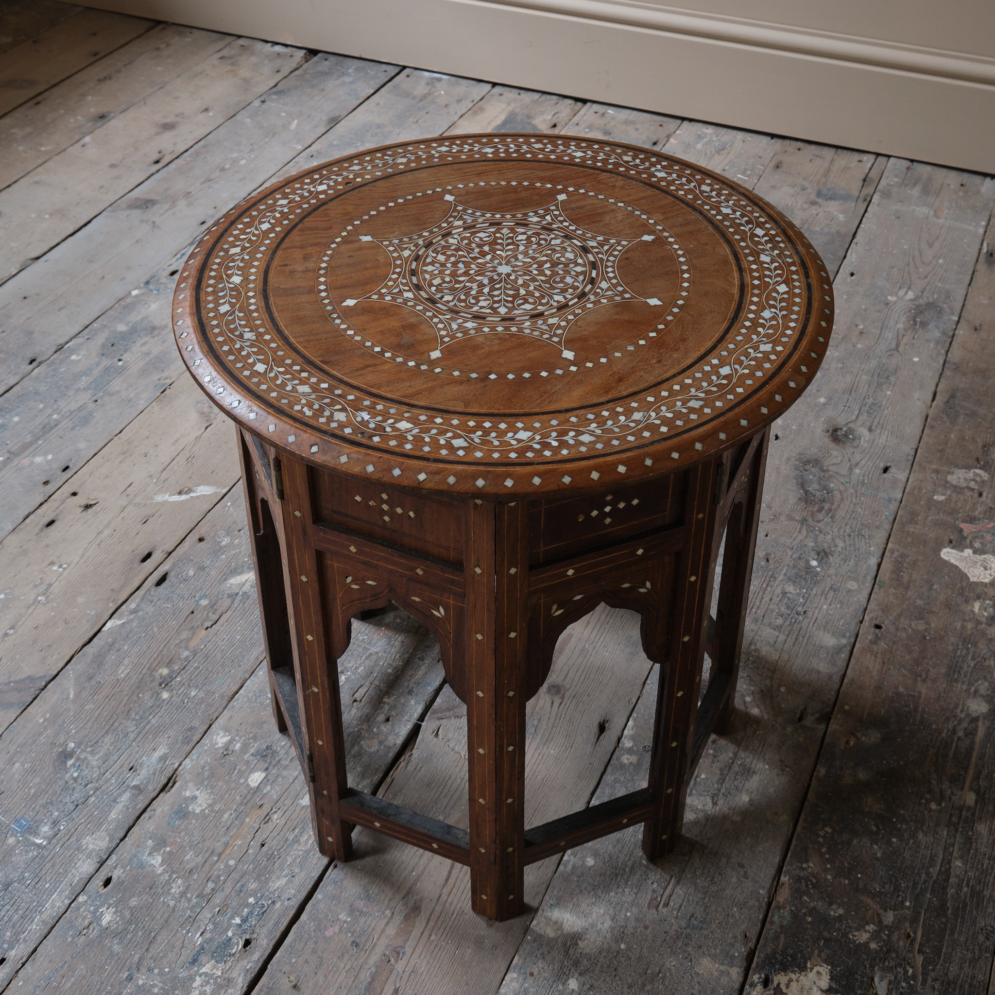 A medium sized early 20th century Hoshiarpur side table. The lift off top with ebony and bone inlay above a folding base also with bone inlay. In good clean order with only a couple of the bone inlays missing.