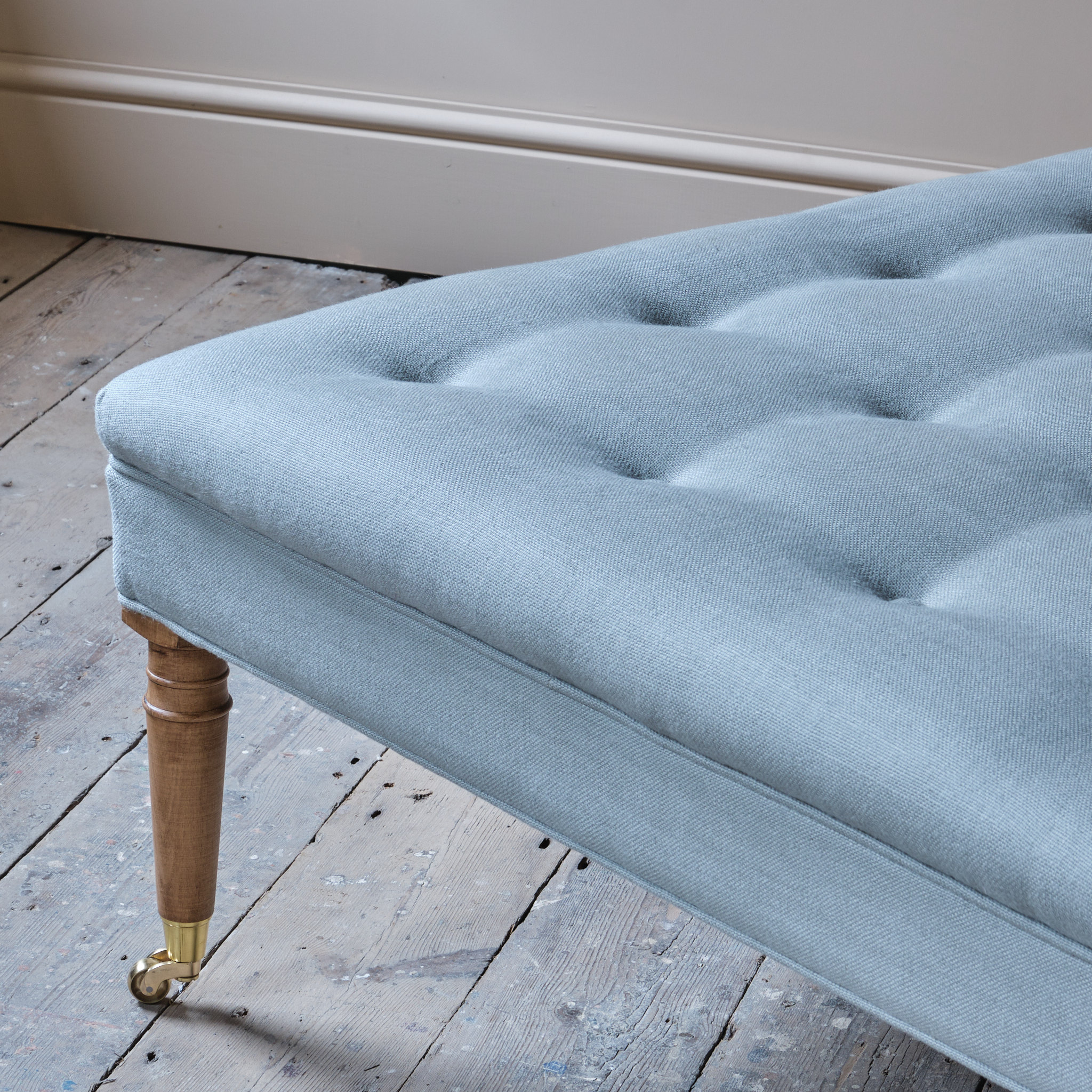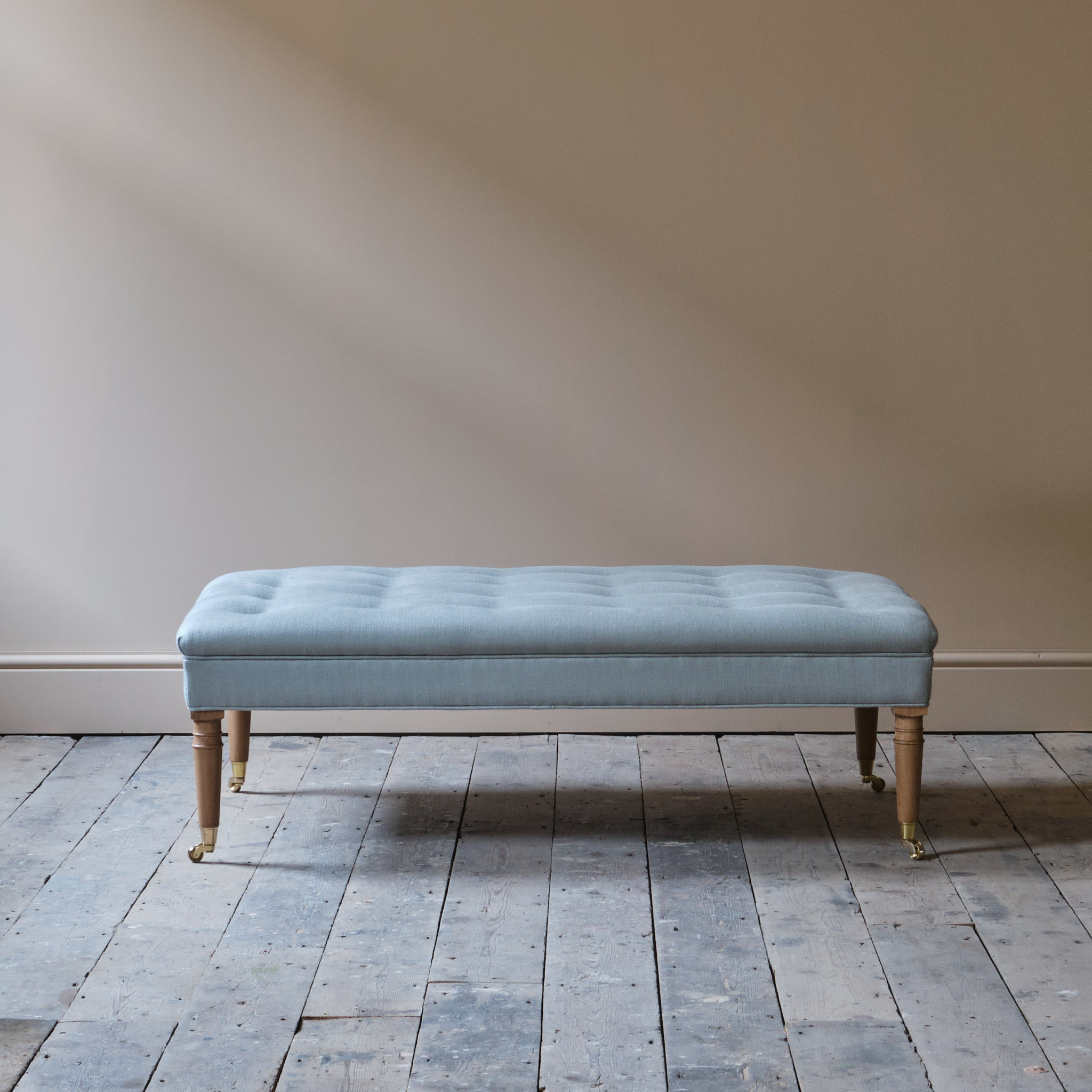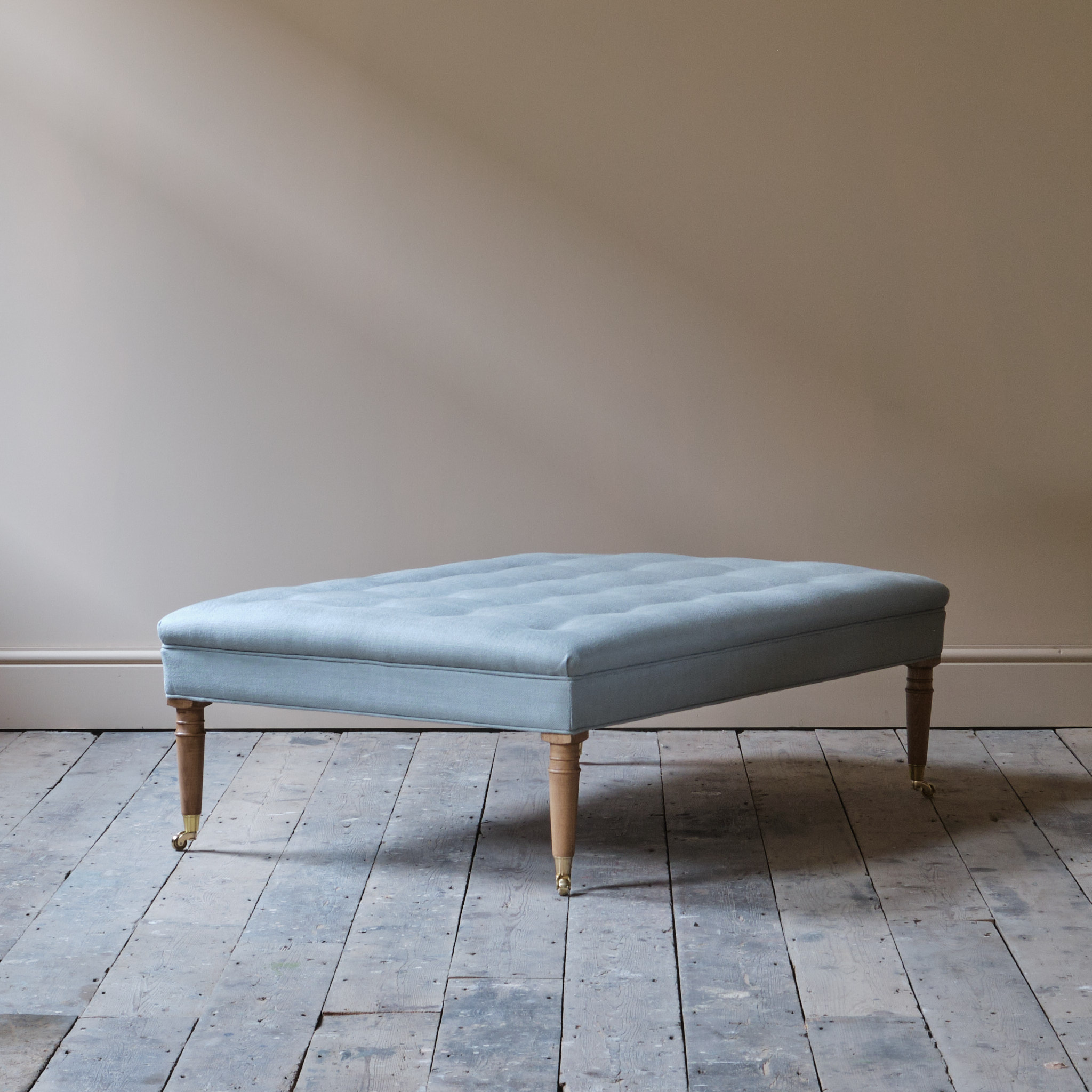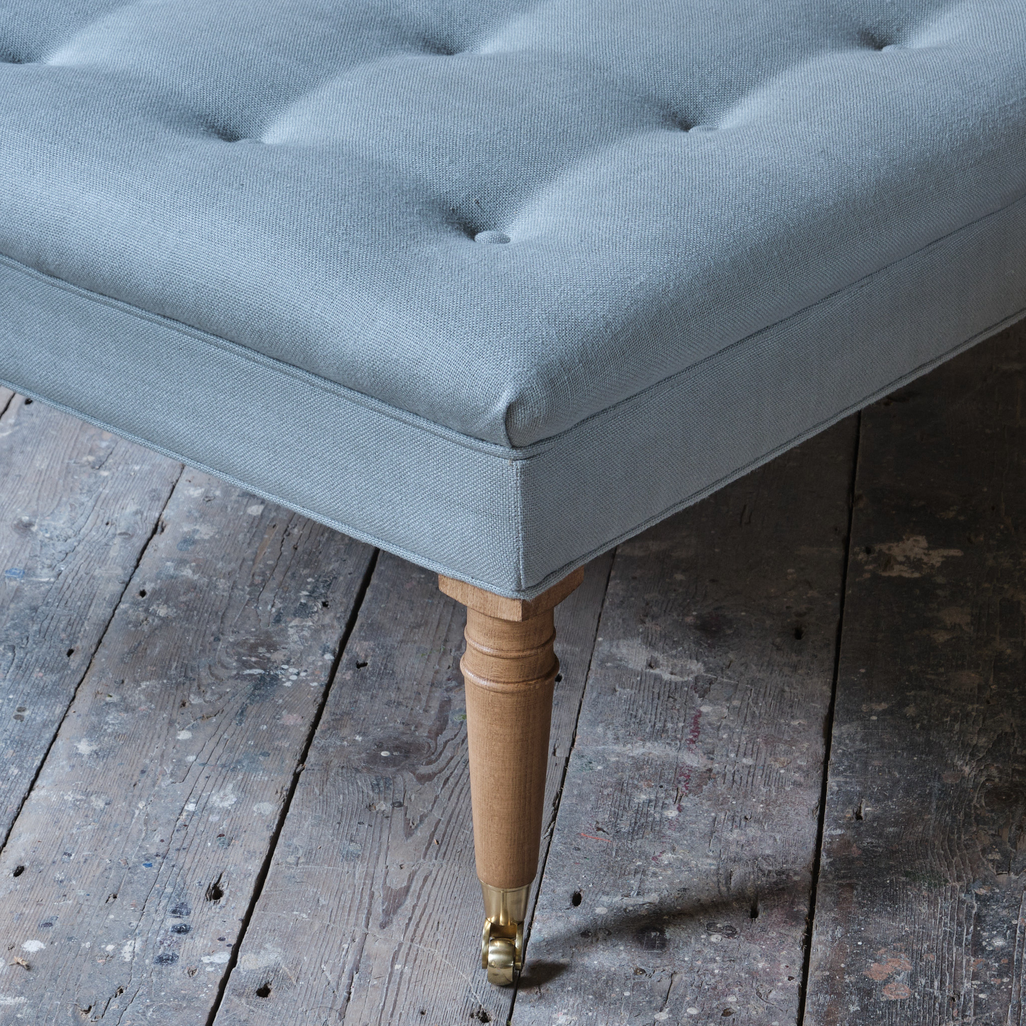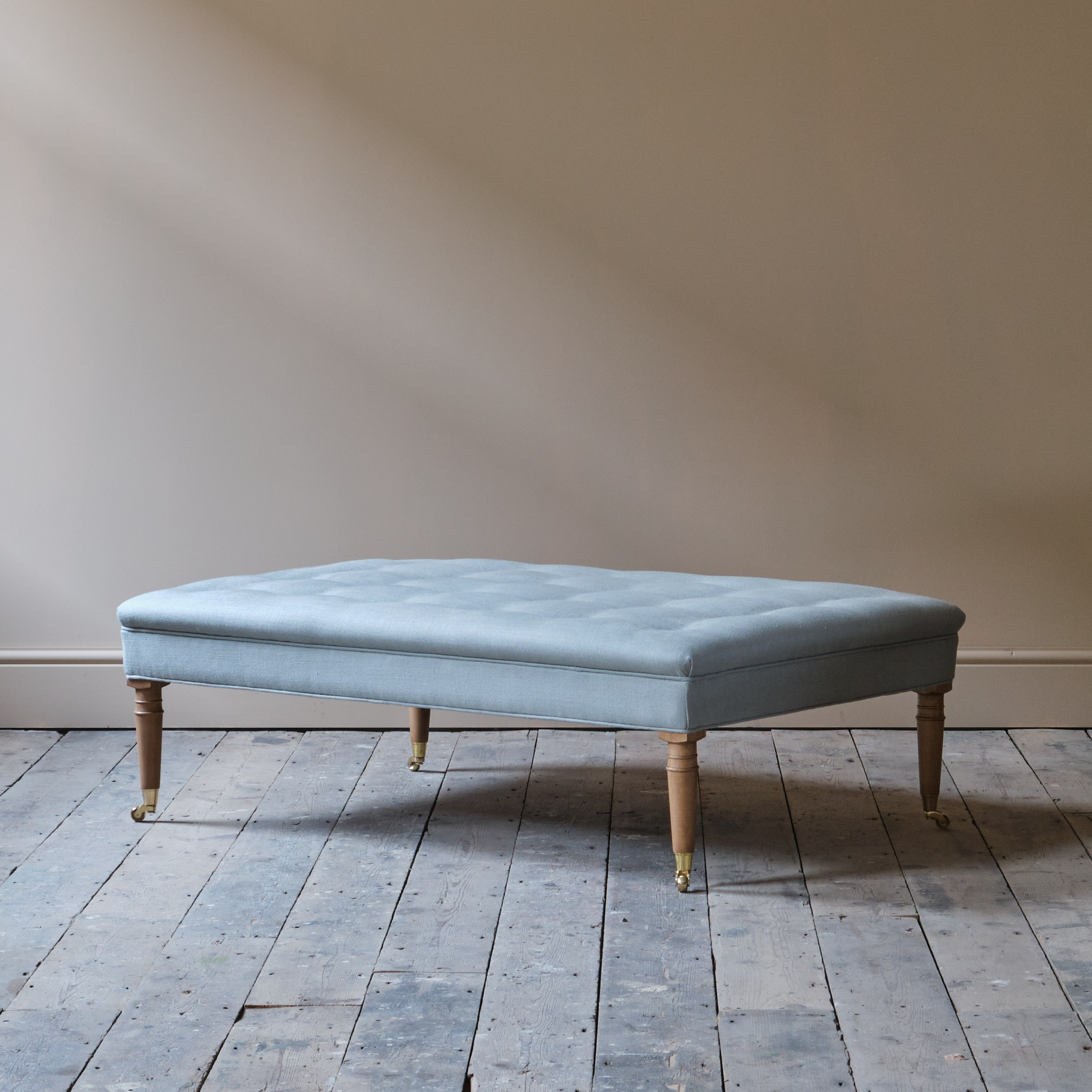 A large country house inspired footstool. Upholstered in Warwick Slubby Lined. Raised on turned beech and reeded legs and casters.