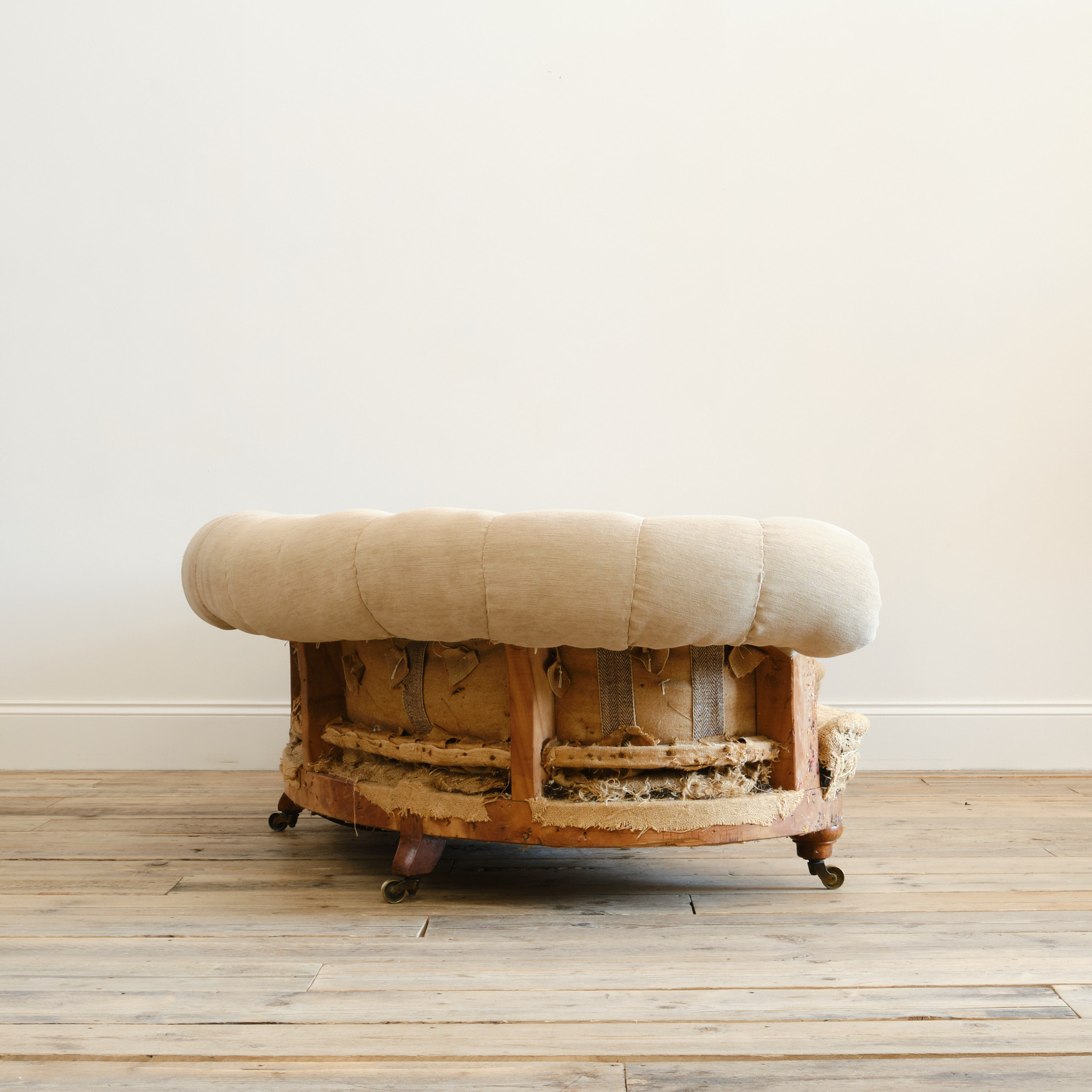 This sofa was originally covered in Howards blue and white monogram cotton lining with a small fragment still visible on the frame. We can supply a reproduction of this cotton fabric or we can supply a harder wearing reproduction natural organic linen. You can of course supply your own choice of fabric.