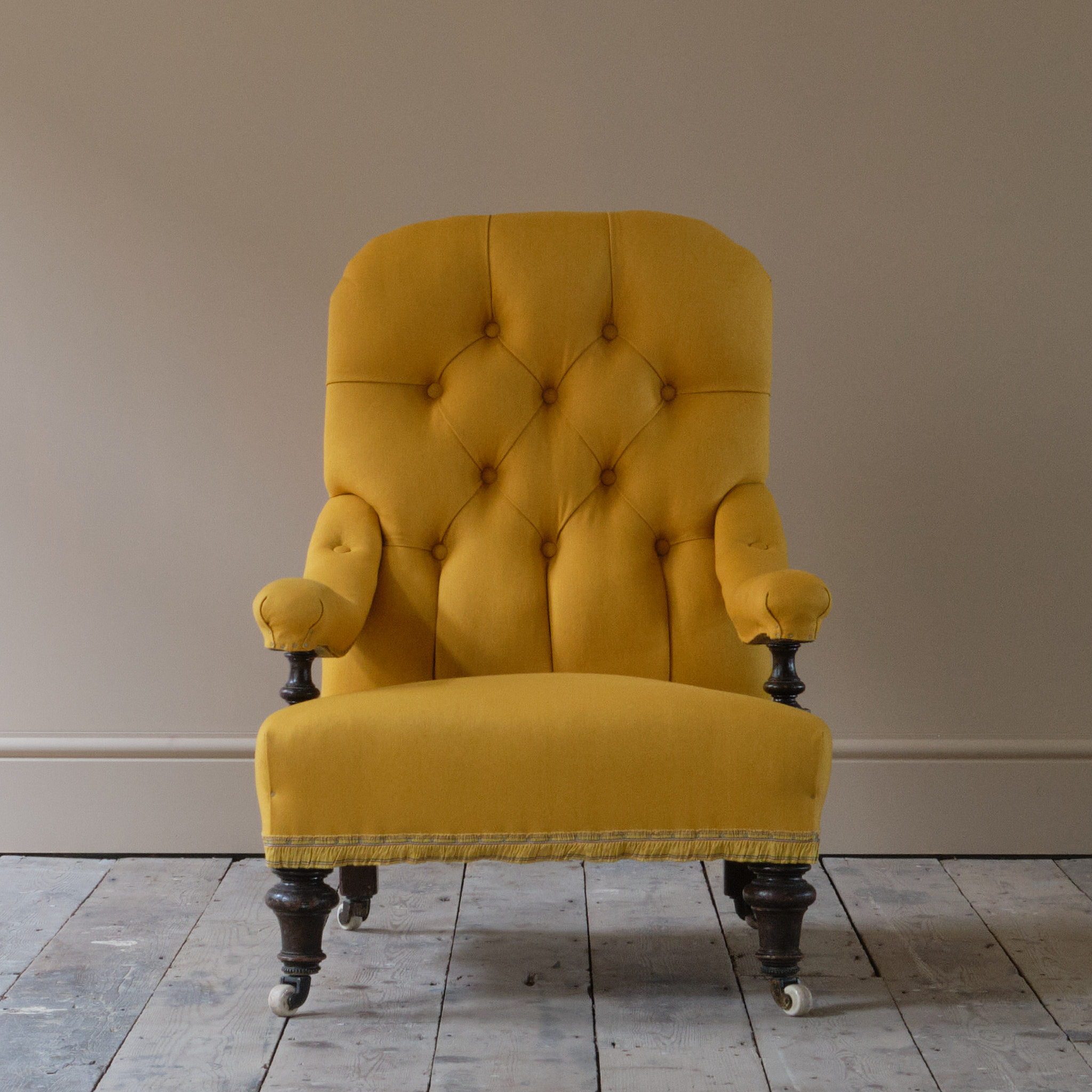 Newly upholstered in yellow linen with antique yellow and green ruffled ribbon around the base