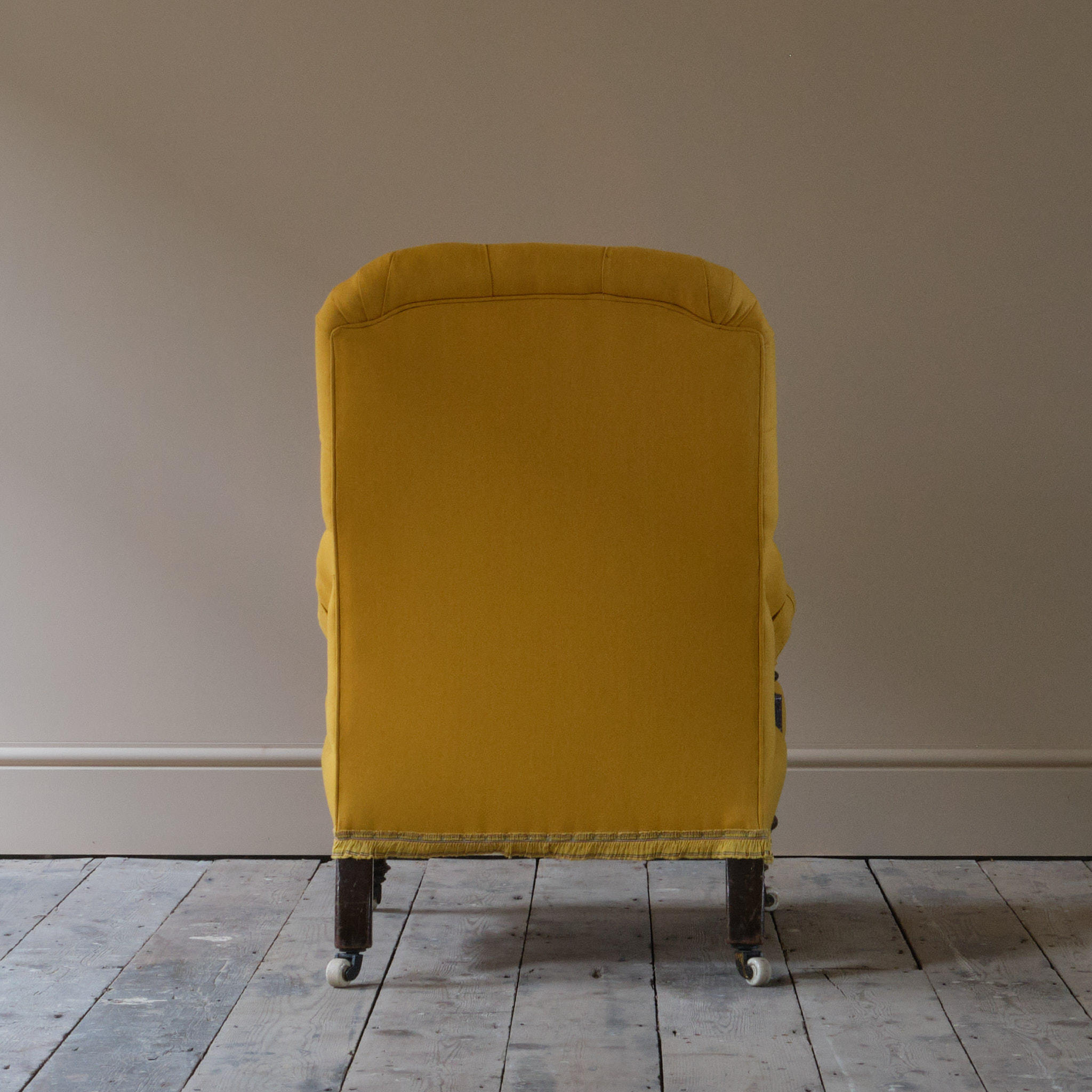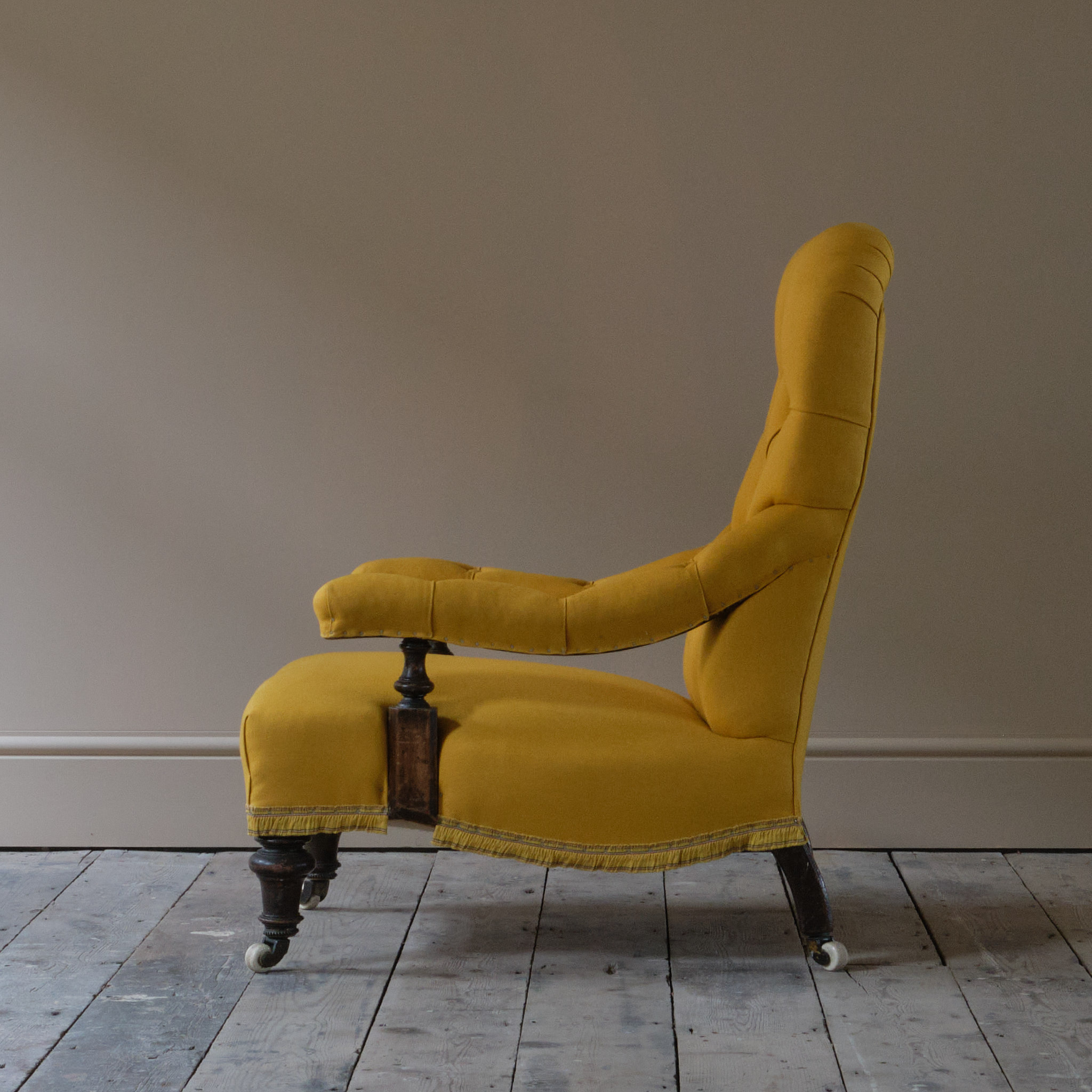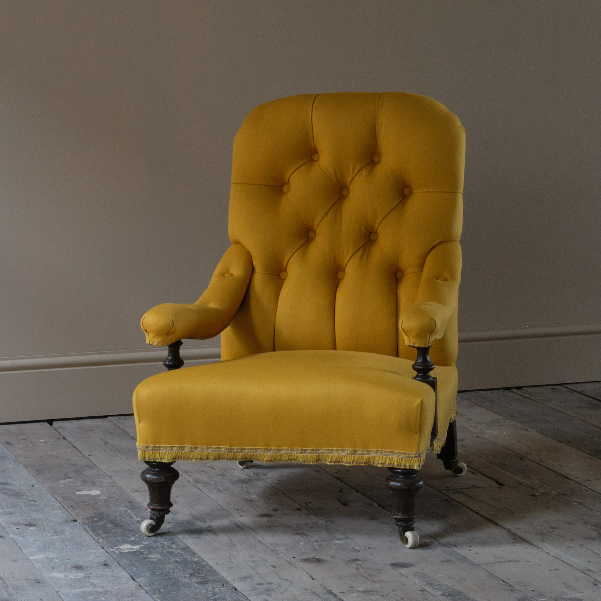 A good quality petite 19th century open armchair raised on mahogany legs and arm supports with all legs retaining the original casters.