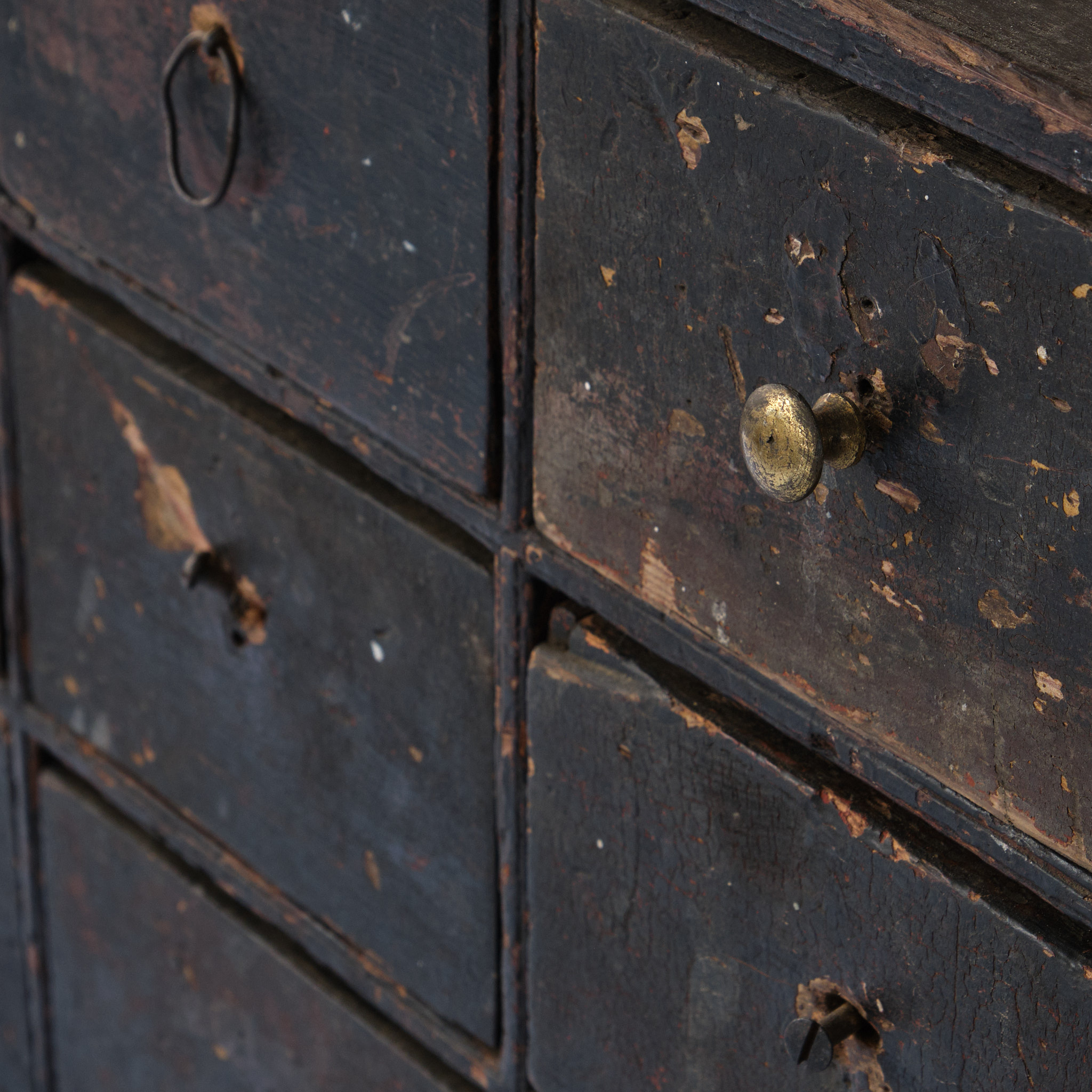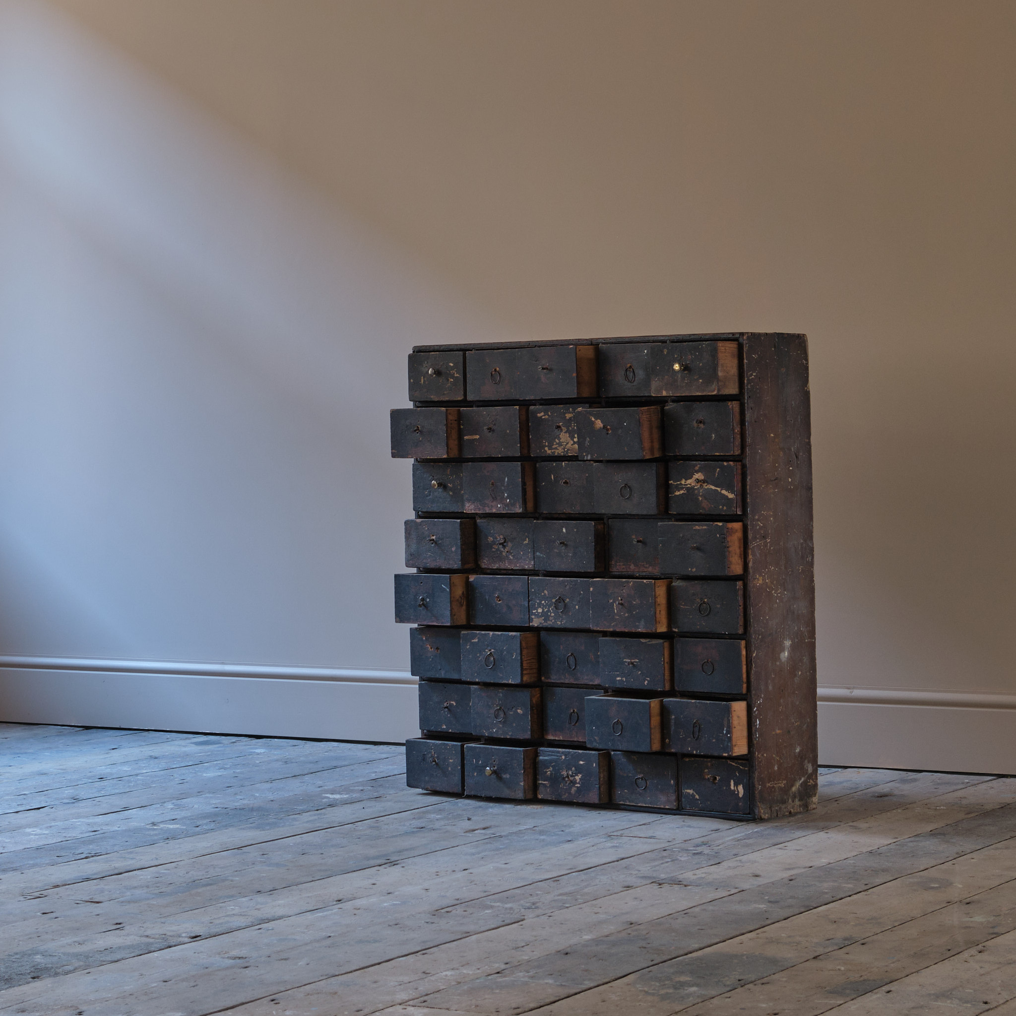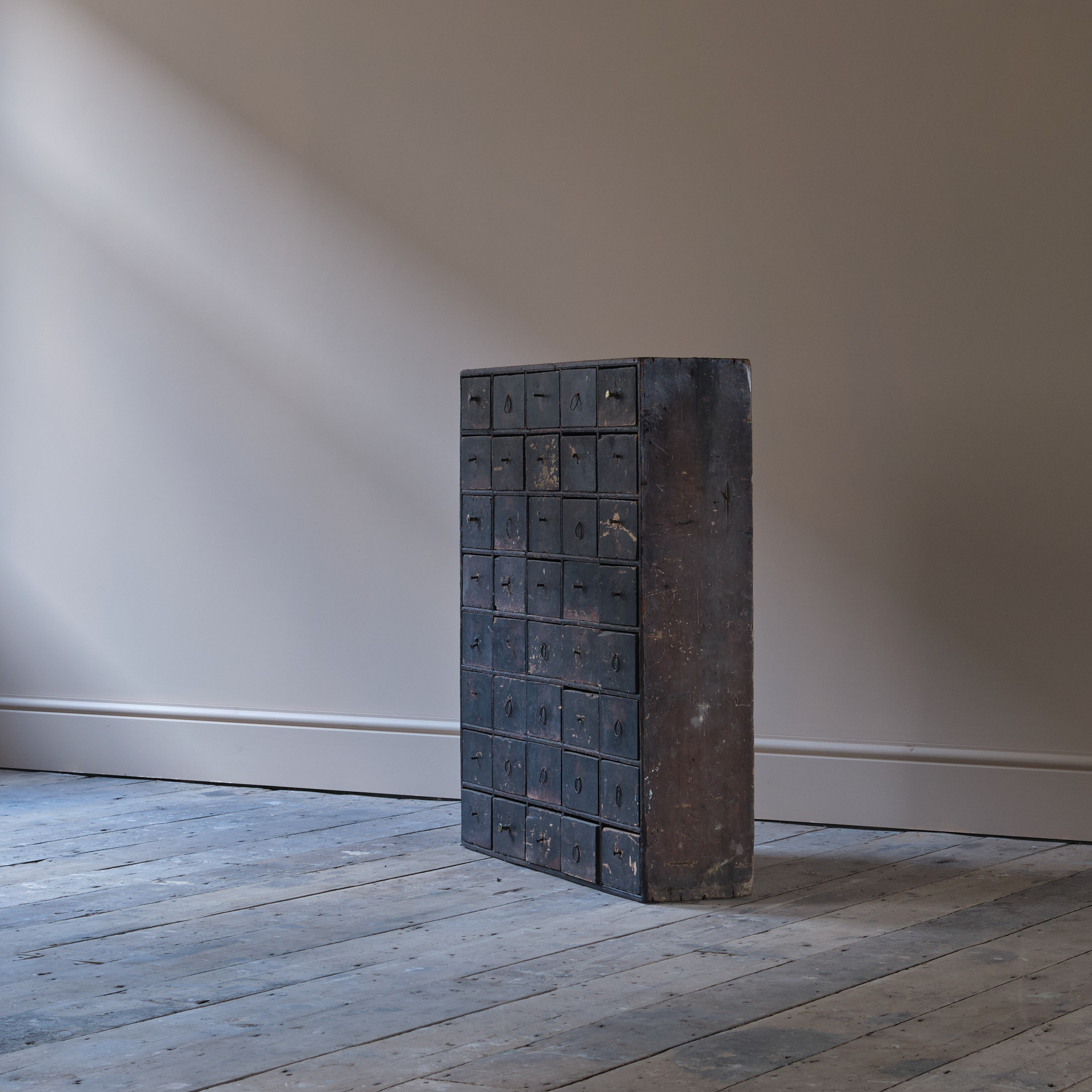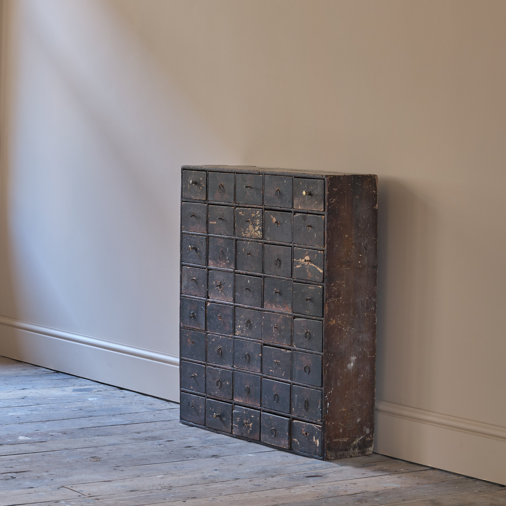 A small early 19th century Georgian pine bank of 40 drawers with a mix of odd make do and mend drawer handles in the form of screws, twisted wire and possible the odd original brass handles.