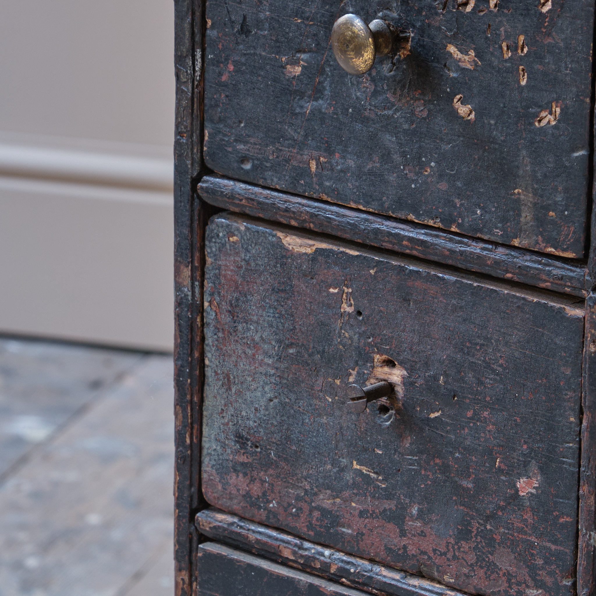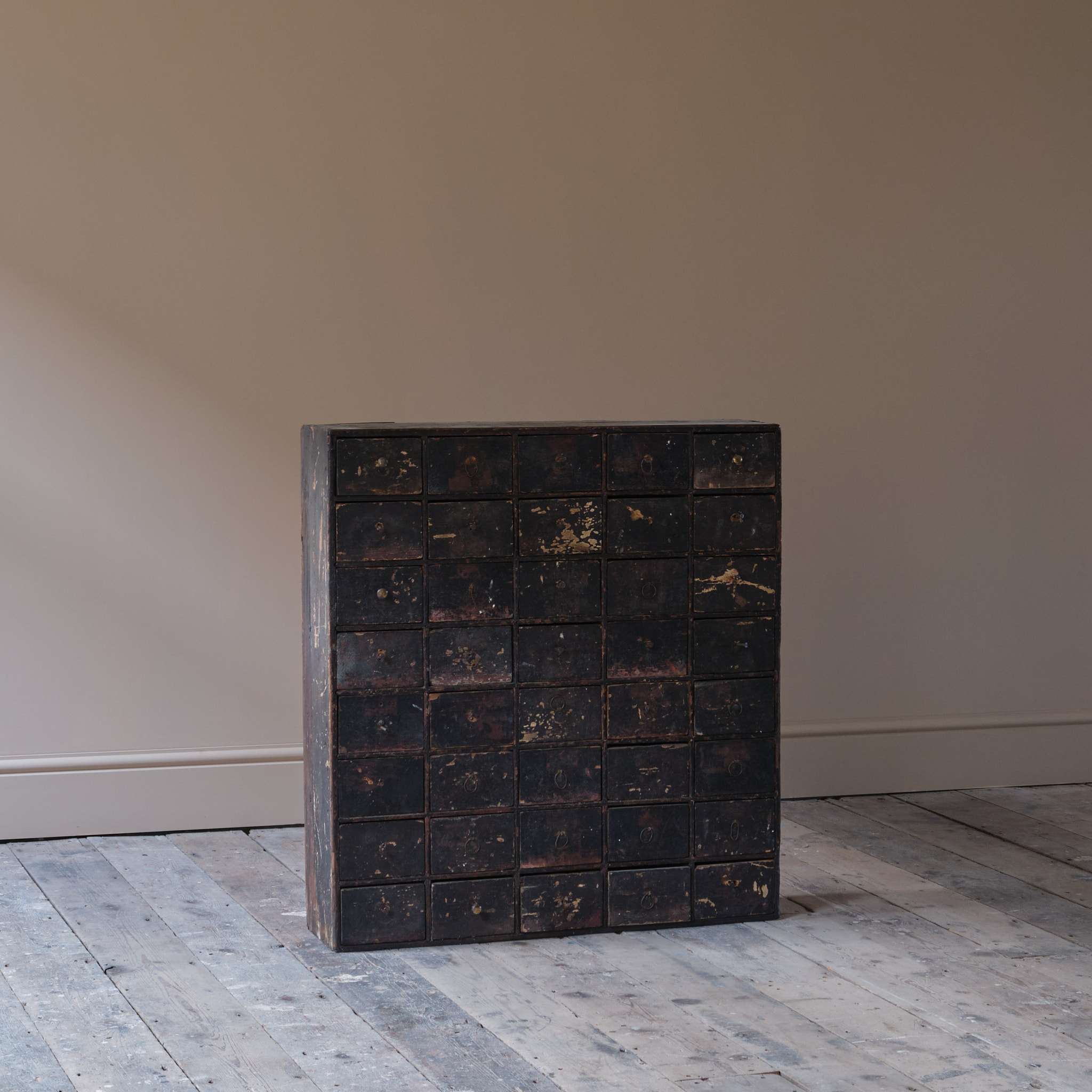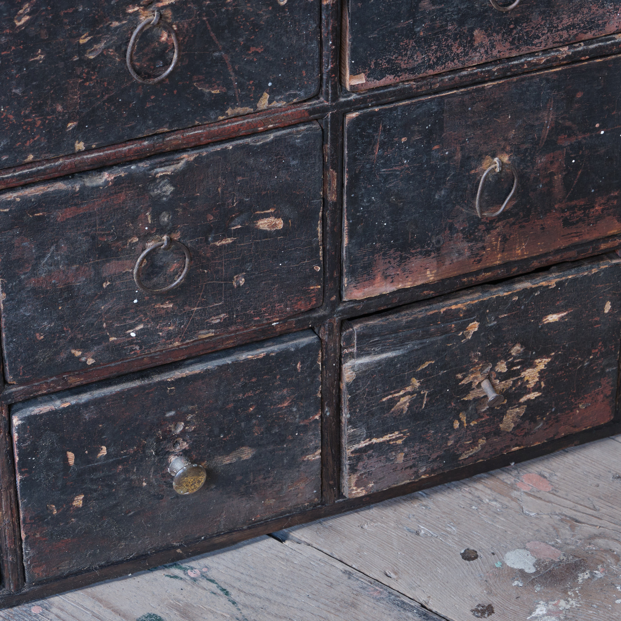A small early 19th century Georgian pine bank of 40 drawers with a mix of odd make do and mend drawer handles in the form of screws, twisted wire and possible the odd original brass handles.