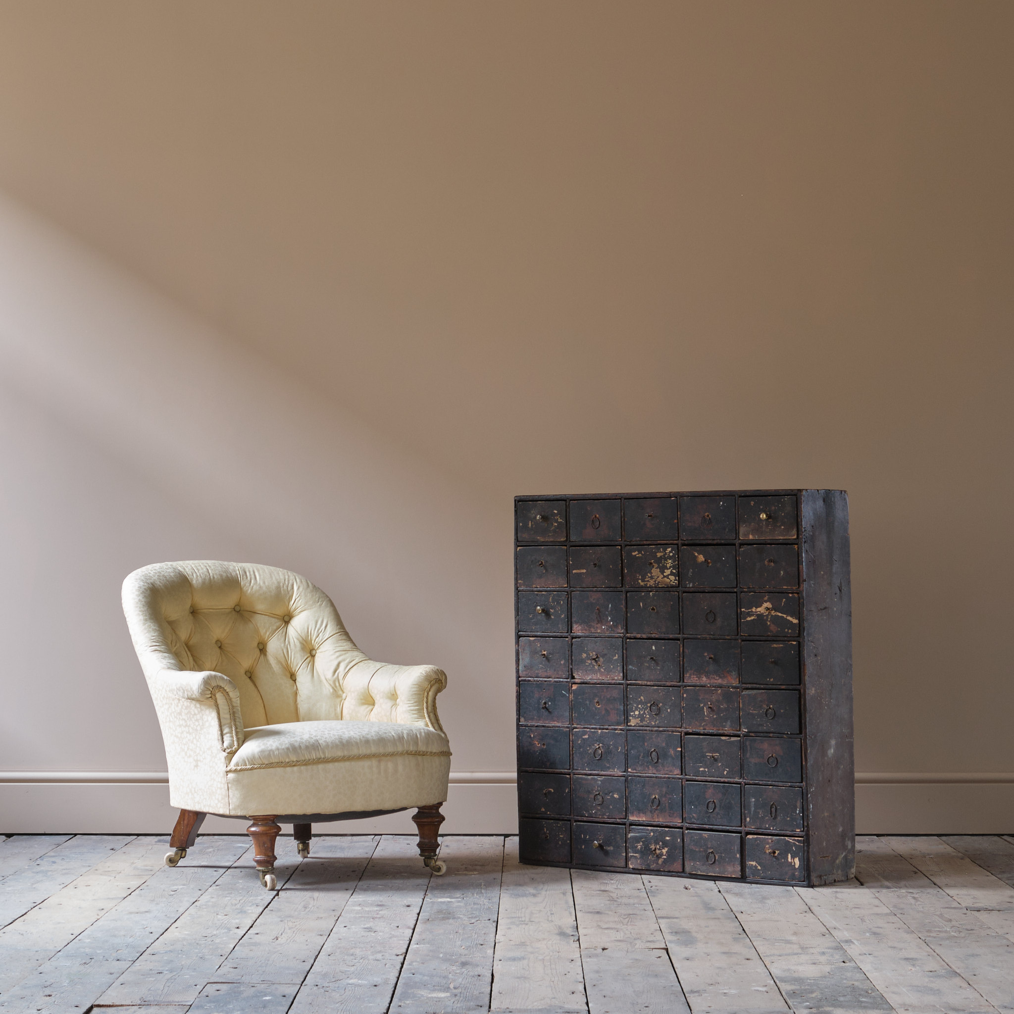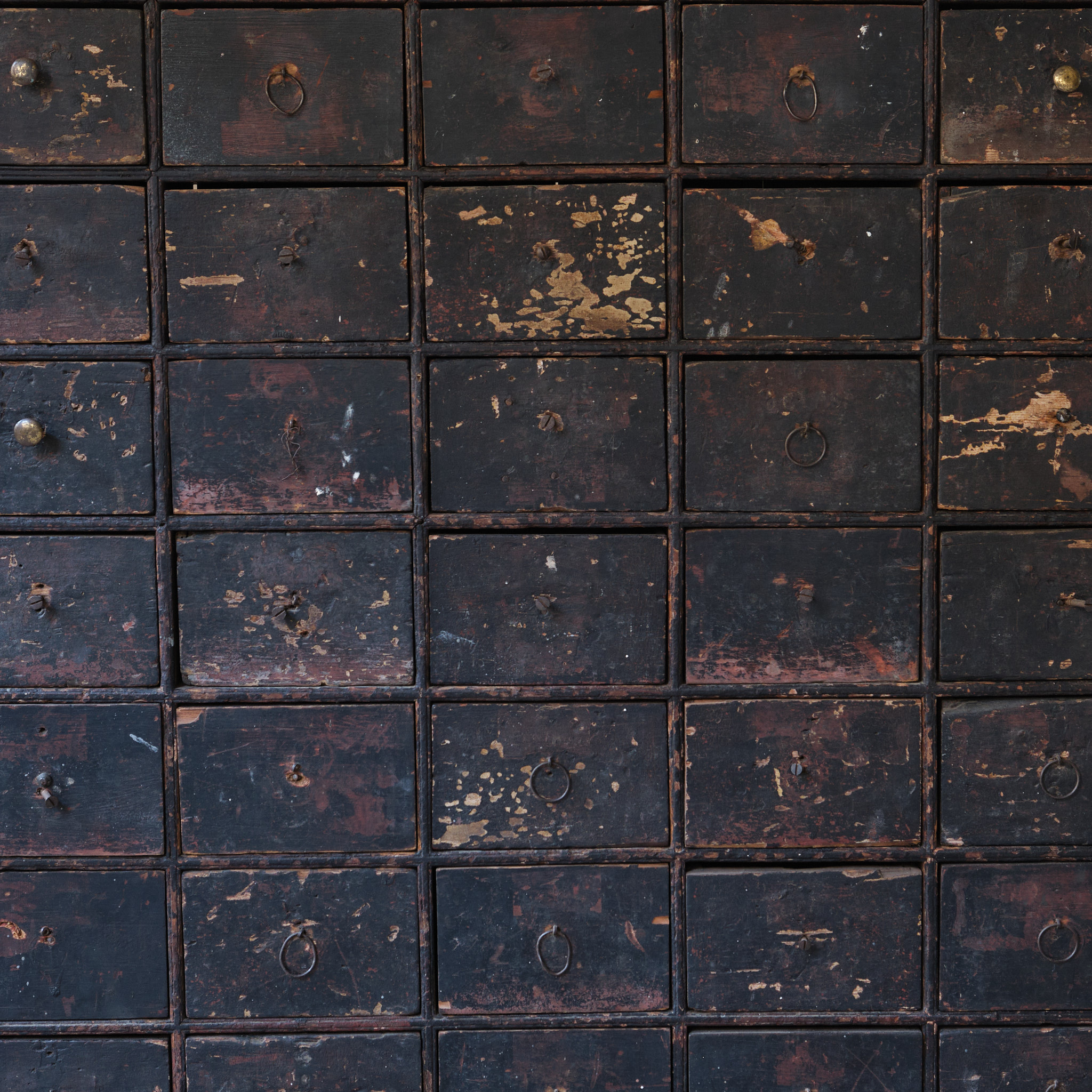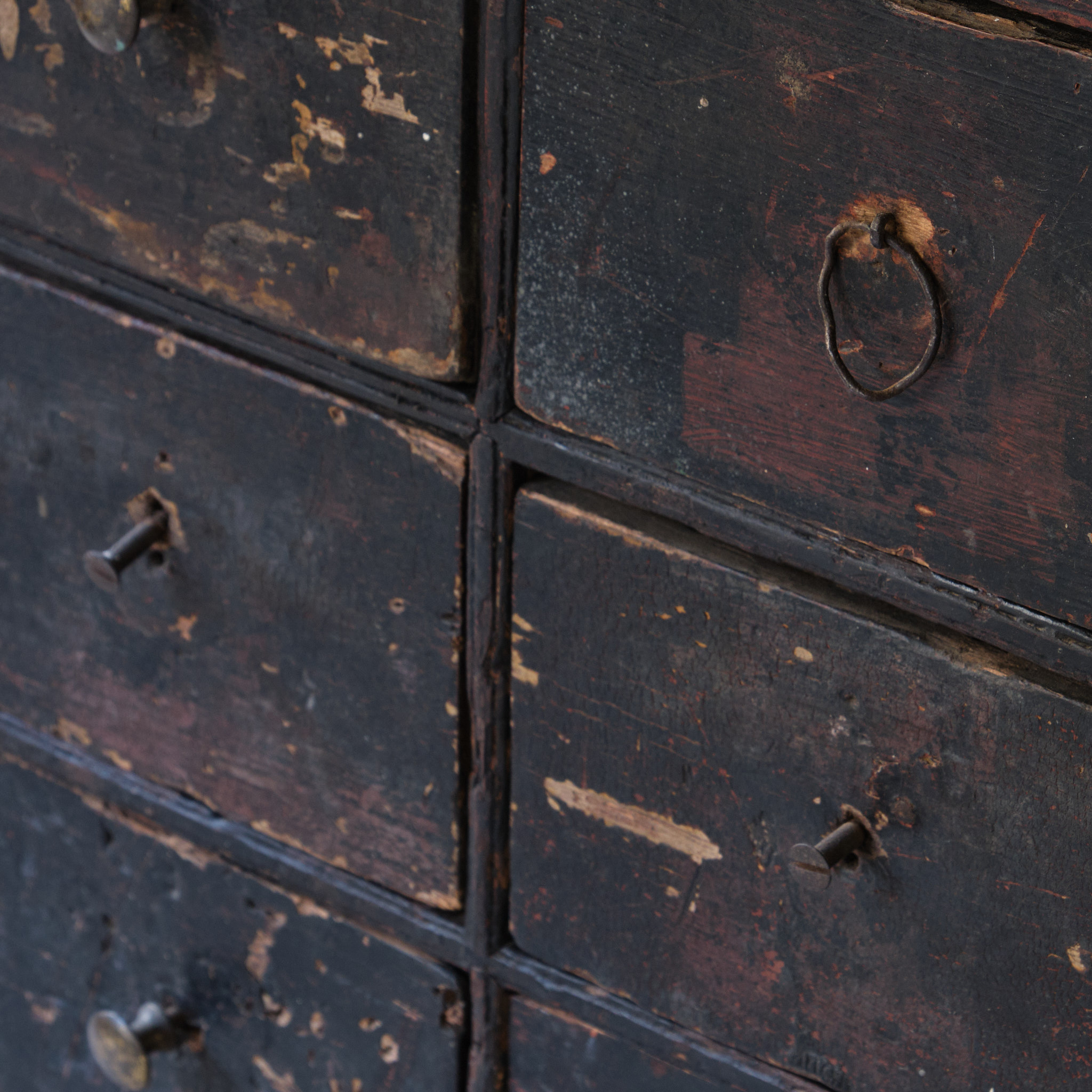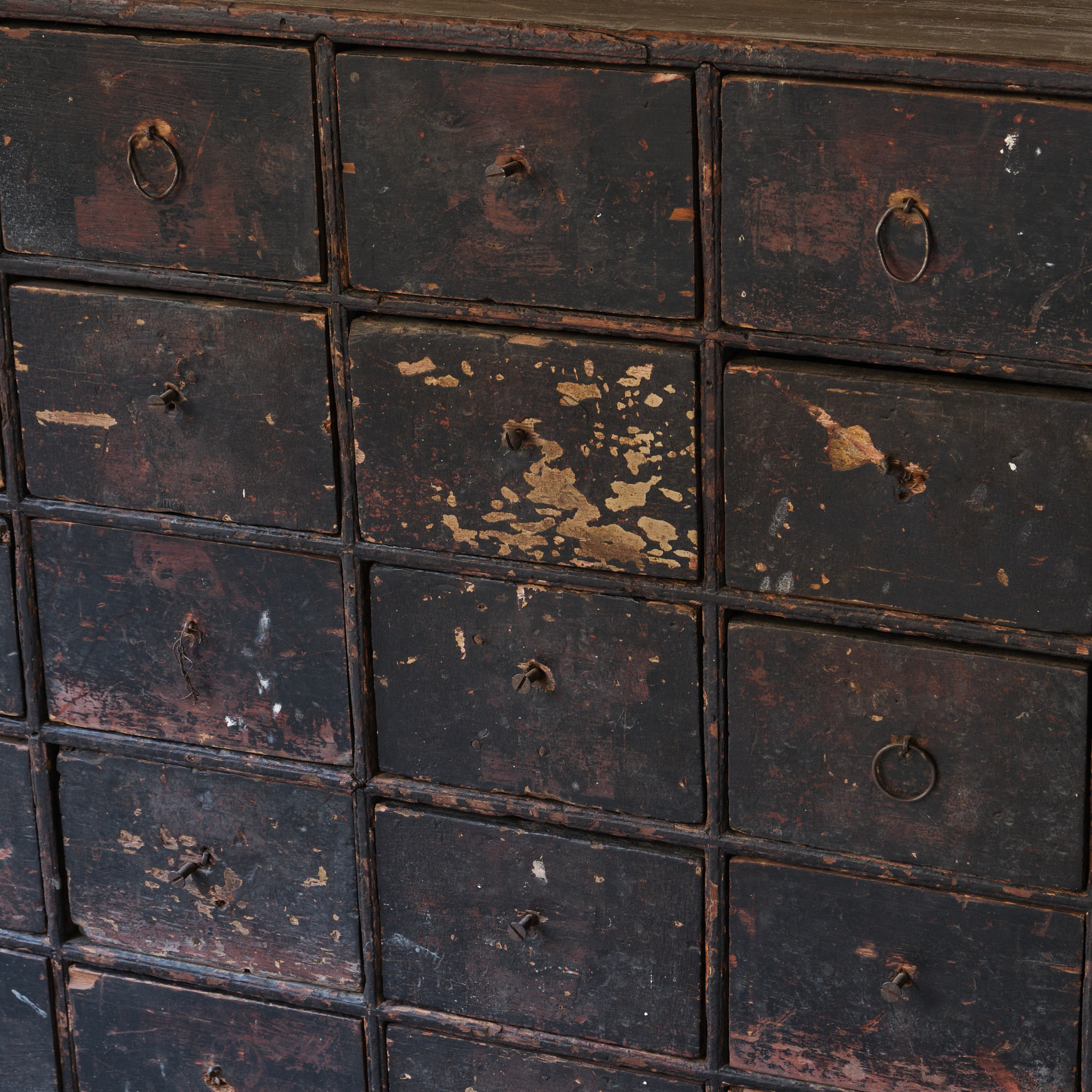 A small early 19th century Georgian pine bank of 40 drawers with a mix of odd make do and mend drawer handles in the form of screws, twisted wire and possible the odd original brass handles.
