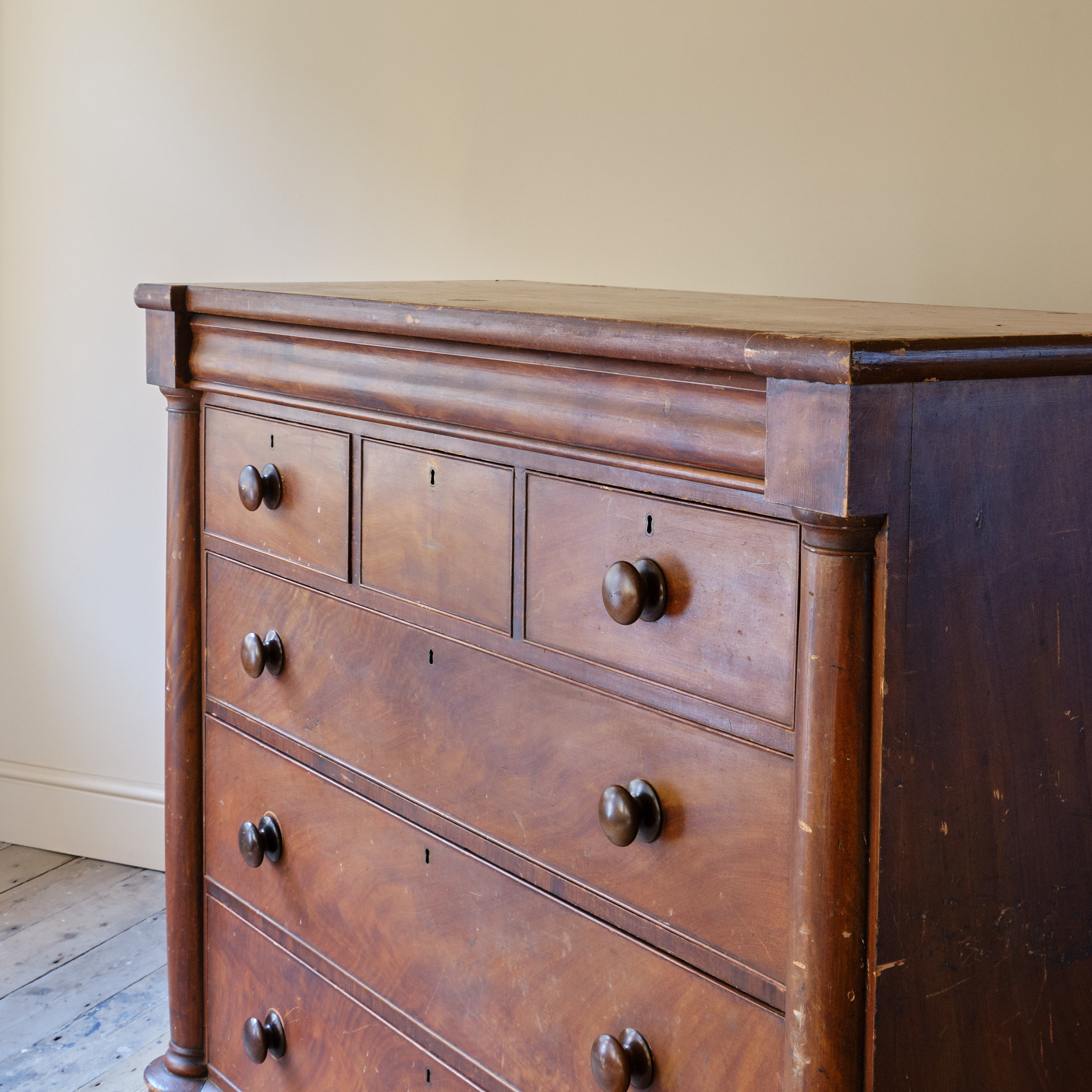 A large mid 19th century Scottish pine chest in its wonderful original simulated Mahogany paint. The drawers with the original fruitwood pulls Comprise of 3 drawers over 3 graduated drawers with a hidden drawer to the frieze all flanked by turned columns and raised on turned but feet.
